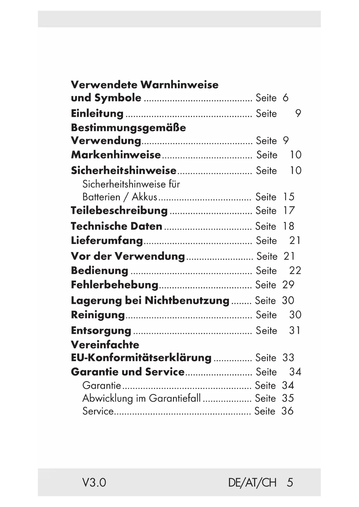 DE/AT/CH Verwendete Warnhinweise und Symbole .......................................... Seite 6 Einleitung ................................................. Seite 9 Bestimmungsgemäße Verwendung ........................................... Seite 9 Markenhinweise ................................... Seite 10 Sicherheitshinweise ............................. Seite 10 Sicherheitshinweise für Batterien / Akkus .................................... Seite 15 Teilebeschreibung ................................ Seite 17 Technische Daten .................................. Seite 18 Lieferumfang .......................................... Seite 21 Vor der Verwendung .......................... Seite 21 Bedienung ............................................... Seite 22 Fehlerbehebung .................................... Seite 29 Lagerung bei Nichtbenutzung ........ Seite 30 Reinigung ................................................. Seite 30 Entsorgung .............................................. Seite 31 Vereinfachte EU-Konformitätserklärung ............... Seite 33 Garantie und Service .......................... Seite 34 Garantie .................................................. Seite 34 Abwicklung im Garantiefall ................... Seite 35 Service..................................................... Seite 36 V3.06 DE/AT/CH Verwendete Warnhinweise und Symbole In dieser Bedienungsanleitung werden die folgenden Symbole und Warnhinweise verwendet: GEFAHR! Dieses Symbol mit dem Signalwort „Gefahr“ bezeichnet eine Gefährdung mit einem hohen Risikograd, die, wenn sie nicht vermieden wird, eine schwere Verletzung oder den Tod zur Folge hat. WARNUNG! Dieses Symbol mit dem Signalwort „Warnung“ bezeichnet eine Gefährdung mit einem mittleren Risikograd, die, wenn sie nicht vermieden wird, den Tod oder eine schwere Verletzung zu Folge haben kann.7 DE/AT/CH VORSICHT! Dieses Symbol mit dem Signalwort „Vorsicht“ bezeichnet eine Gefährdung mit einem niedrigen Risikograd, die, wenn sie nicht vermieden wird, eine geringe oder mäßige Verletzung zur Folge haben kann. ACHTUNG! Dieses Symbol weist in Kombination mit dem Signalwort „ACHTUNG“ auf einen möglichen Sachschaden hin. HINWEIS: Dieses Symbol mit dem Signalwort „Hinweis“ bietet weitere nützliche Informationen.