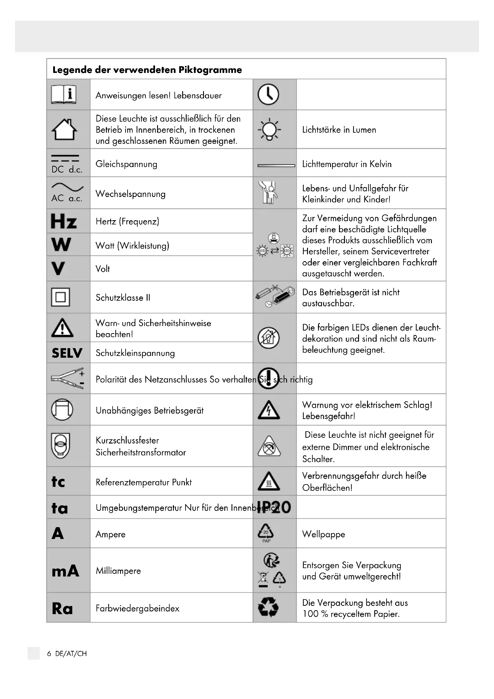 Farbwiedergabeindex Die Verpackung besteht aus 100 % recyceltem Papier.7 DE/AT/CH Legende der verwendeten Piktogramme/Einleitung Legende der verwendeten Piktogramme