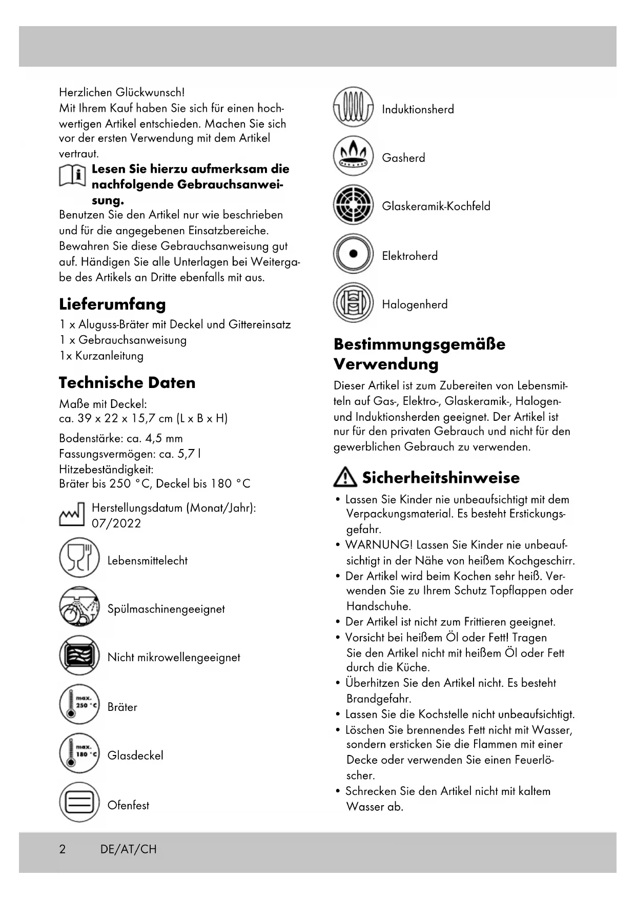 Használati útmutató2 Herzlichen Glückwunsch! Mit Ihrem Kauf haben Sie sich für einen hoch- wertigen Artikel entschieden. Machen Sie sich vor der ersten Verwendung mit dem Artikel vertraut. Lesen Sie hierzu aufmerksam die nachfolgende Gebrauchsanwei- sung. Benutzen Sie den Artikel nur wie beschrieben und für die angegebenen Einsatzbereiche. Bewahren Sie diese Gebrauchsanweisung gut auf. Händigen Sie alle Unterlagen bei Weiterga- be des Artikels an Dritte ebenfalls mit aus. Lieferumfang 1 x Aluguss-Bräter mit Deckel und Gittereinsatz 1 x Gebrauchsanweisung 1x Kurzanleitung Technische Daten Maße mit Deckel: ca. 39 x 22 x 15,7 cm (L x B x H) Bodenstärke: ca. 4,5 mm Fassungsvermögen: ca. 5,7 l Hitzebeständigkeit: Bräter bis 250 °C, Deckel bis 180 °C Herstellungsdatum (Monat/Jahr): 07/2022 Lebensmittelecht Spülmaschinengeeignet Nicht mikrowellengeeignet Bräter Glasdeckel Ofenfest Induktionsherd Gasherd Glaskeramik-Kochfeld Elektroherd Halogenherd Bestimmungsgemäße Verwendung Dieser Artikel ist zum Zubereiten von Lebensmit- teln auf Gas-, Elektro-, Glaskeramik-, Halogen- und Induktionsherden geeignet. Der Artikel ist nur für den privaten Gebrauch und nicht für den gewerblichen Gebrauch zu verwenden. Sicherheitshinweise