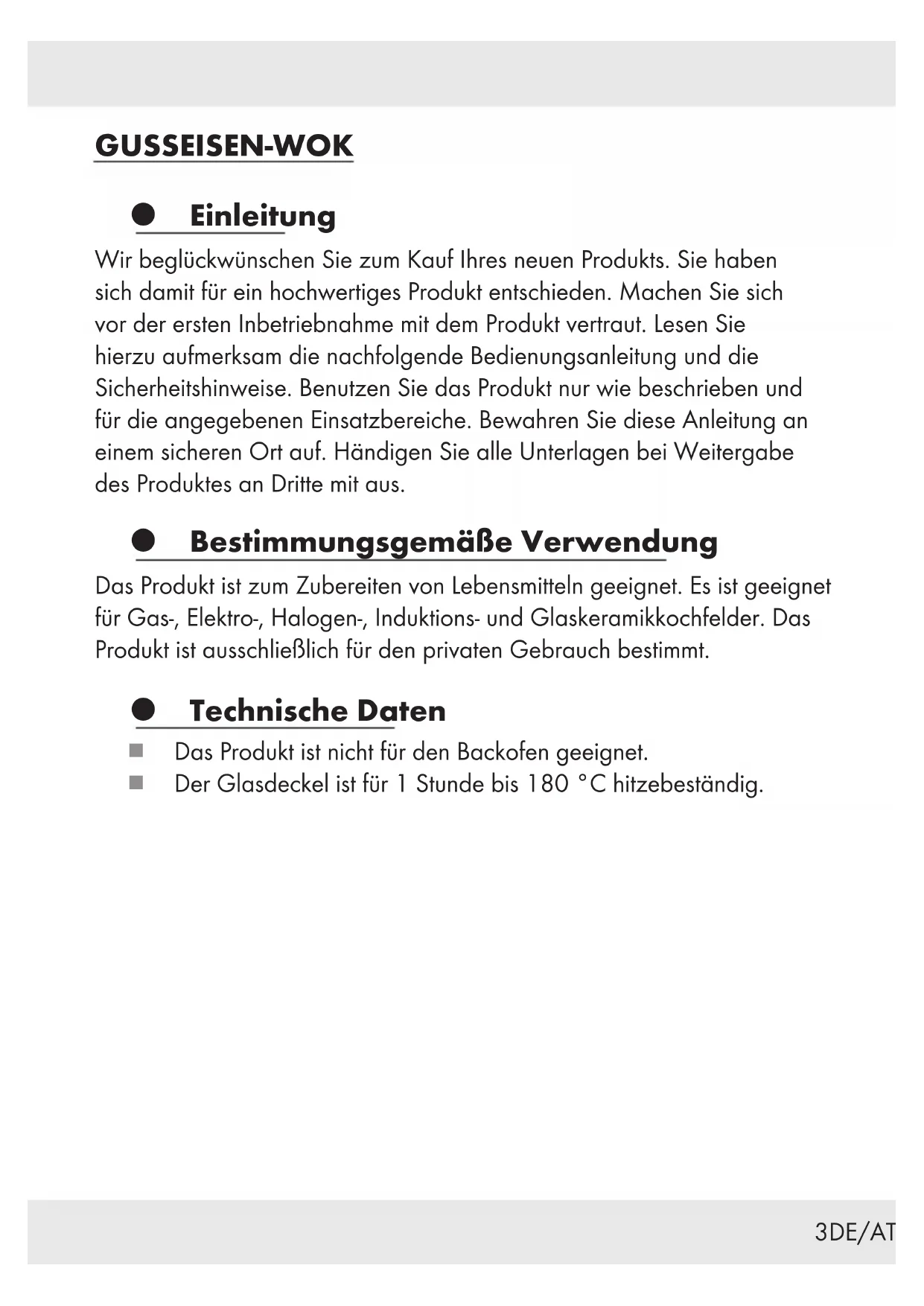 Navodila za upravljanje in varnostna opozorila Stran 823DE/AT/CH GUSSEISEN-WOK Einleitung Wir beglückwünschen Sie zum Kauf Ihres neuen Produkts. Sie haben sich damit für ein hochwertiges Produkt entschieden. Machen Sie sich vor der ersten Inbetriebnahme mit dem Produkt vertraut. Lesen Sie hierzu aufmerksam die nachfolgende Bedienungsanleitung und die Sicherheitshinweise. Benutzen Sie das Produkt nur wie beschrieben und für die angegebenen Einsatzbereiche. Bewahren Sie diese Anleitung an einem sicheren Ort auf. Händigen Sie alle Unterlagen bei Weitergabe des Produktes an Dritte mit aus. Bestimmungsgemäße Verwendung Das Produkt ist zum Zubereiten von Lebensmitteln geeignet. Es ist geeignet für Gas-, Elektro-, Halogen-, Induktions- und Glaskeramikkochfelder. Das Produkt ist ausschließlich für den privaten Gebrauch bestimmt. Technische Daten Das Produkt ist nicht für den Backofen geeignet. Der Glasdeckel ist für 1 Stunde bis 180 °C hitzebeständig.4 DE/AT/CH Sicherheitshinweise