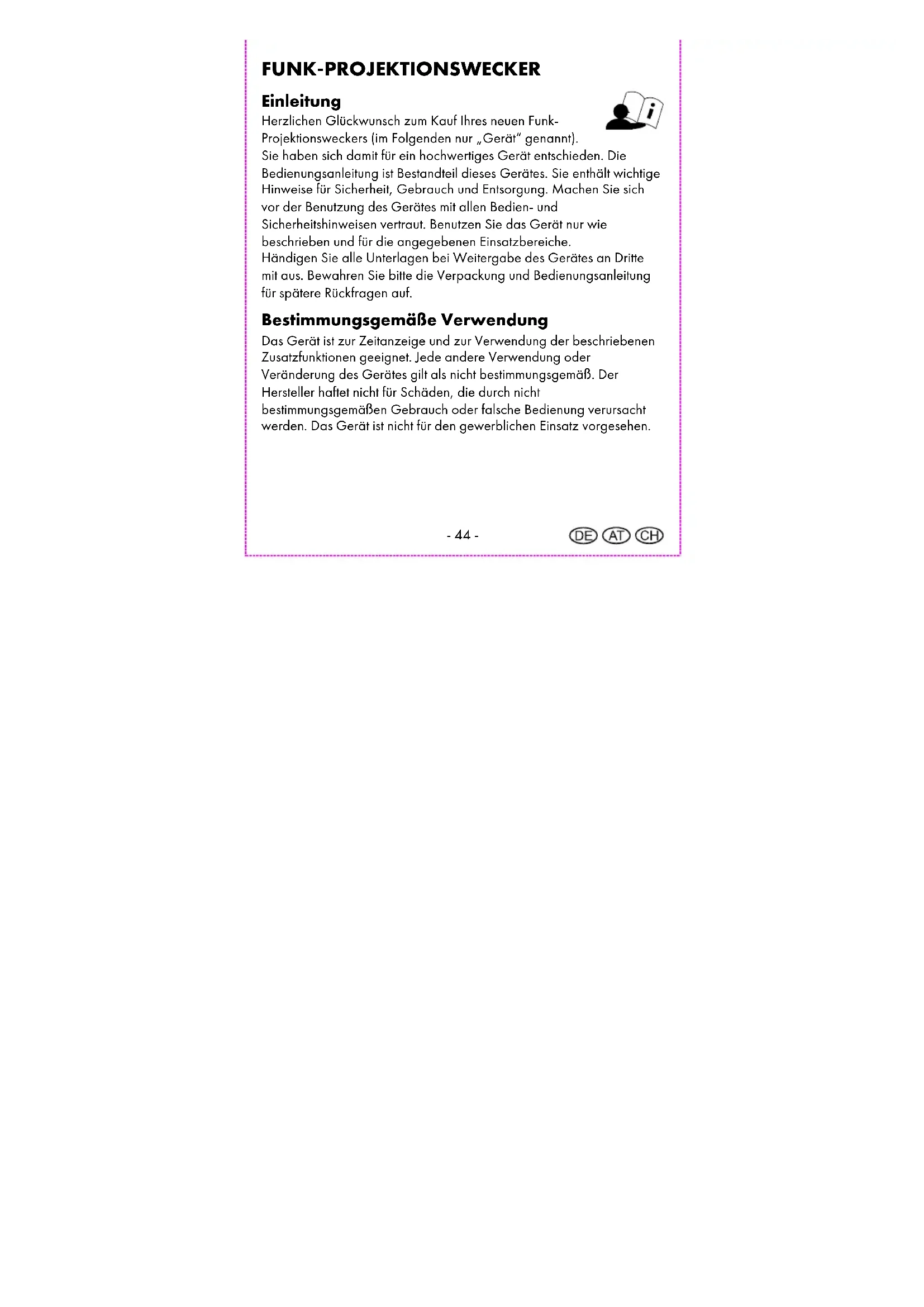 Supplier Please note that the following address is not a service address. Please first contact the service address (see above). digi-tech gmbh Valterweg 27A 65817 Eppstein GERMANY- 41 - Bedienungs- und Sicherheitshinweise Inhaltsverzeichnis Inhaltsverzeichnis ................................................................................ - 41 - Einleitung ............................................................................................. - 44 - Bestimmungsgemäße Verwendung ................................................... - 44 - Lieferumfang ........................................................................................ - 45 - Technische Daten ................................................................................ - 45 - Funk-Projektionswecker ................................................................ - 45 - Steckernetzteil ............................................................................... - 46 - Zeichenerklärung ................................................................................ - 47 - Wichtige Sicherheitshinweise Wichtige SicherheitshinweiseWichtige Sicherheitshinweise Wichtige Sicherheitshinweise ......................................................... - 50 - Sicherheitshinweise für Benutzer ................................................. - 50 - Sicherheitshinweise zu den Batterien .......................................... - 51 - Gefahr durch Elektrizität .............................................................. - 53 - Das Gerät sicher aufstellen .......................................................... - 56 - Front mit Display ................................................................................. - 58 - Rückseite mit Bedienfeldern ............................................................... - 59 - Inbetriebnahme ................................................................................... - 60 - Spannungsversorgung ................................................................. - 61 -- 42 - Funkempfang....................................................................................... - 61 - Empfangsstörung .......................................................................... - 61 - Funkempfang neustarten ausschalten ......................................... - 62 - Displaybeleuchtung einschalten/dimmen ........................................ - 62 - Projektion ............................................................................................. - 63 - Kurzzeitige Projektion .................................................................. - 63 - Dauerhafte Projektion ................................................................... - 63 - Projektion einstellen ...................................................................... - 63 - Projektion zwischen Uhrzeit, Temperatur und Alarmzeit wechseln ...................................................................... - 64 - Bedienung ........................................................................................... - 65 - Schnelleinstellung ......................................................................... - 65 - Grundeinstellung .......................................................................... - 65 - 12-/24-Stundenformat anzeigen ............................................... - 65 - Temperatureinheit einstellen ........................................................ - 66 - Sprache der Wochentagsanzeige einstellen ............................. - 66 - Kalenderwoche anzeigen ........................................................... - 66 - Zweite Uhrzeit einstellen (SECOND TIME) ................................ - 67 - Zeitzonenanpassung .................................................................... - 67 - Alarm ................................................................................................... - 68 - Alarm einstellen ............................................................................ - 68 - Alarm aktivieren/deaktivieren .................................................... - 68 -- 43 - Schlummerfunktion (SNOOZE) ................................................... - 69 - Batteriestandsanzeige ........................................................................ - 69 - Reinigungshinweis .............................................................................. - 70 - Lagerung.............................................................................................. - 70 - Vereinfachte EU-Konformitätserklärung ............................................ - 71 - Entsorgung........................................................................................... - 71 - Entsorgung des Elektrogeräts ...................................................... - 72 - Entsorgung der Batterien .............................................................. - 74 - Recycling ....................................................................................... - 76 - Müllentsorgung ............................................................................. - 76 - Garantie der digi-tech gmbh ............................................................. - 76 - Garantiebedingungen ................................................................. - 77 - Garantiezeit und gesetzliche Mängelansprüche....................... - 77 - Garantieumfang ........................................................................... - 77 - Abwicklung im Garantiefall ......................................................... - 78 - Service ................................................................................................. - 79 - Lieferant ............................................................................................... - 81 -- 44 - FUNK-PROJEKTIONSWECKER Einleitung Herzlichen Glückwunsch zum Kauf Ihres neuen Funk- Projektionsweckers (im Folgenden nur „Gerät“ genannt). Sie haben sich damit für ein hochwertiges Gerät entschieden. Die Bedienungsan
