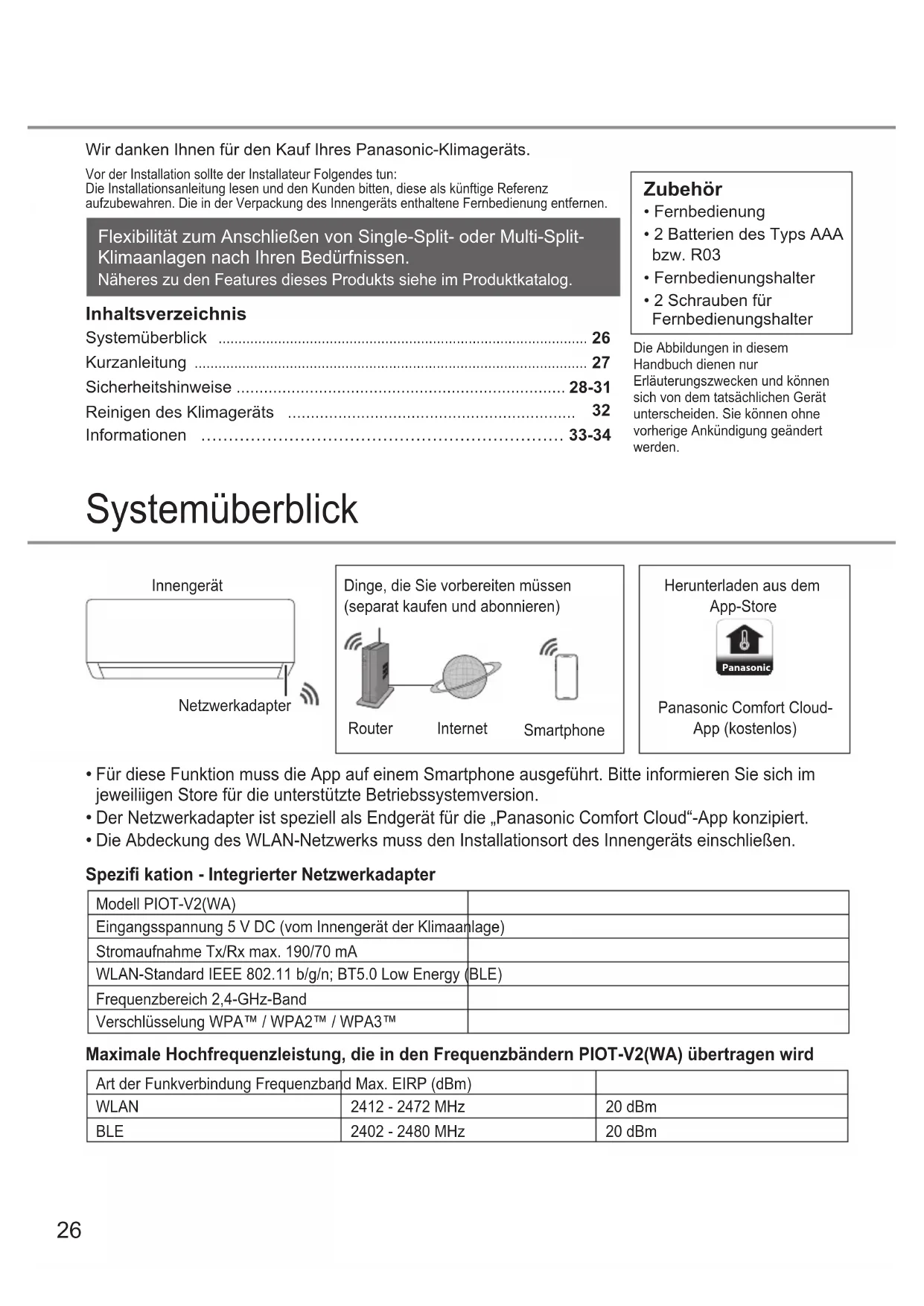 Die Abdeckung des WLAN-Netzwerks muss den Installationsort des Innengeräts einschließen. Panasonic Herunterladen aus dem App-Store Router Internet Smartphone Dinge, die Sie vorbereiten müssen (separat kaufen und abonnieren) Panasonic Comfort Cloud- App (kostenlos) Innengerät Netzwerkadapter Modell PIOT-V2(WA) Eingangsspannung 5 V DC (vom Innengerät der Klimaanlage) Stromaufnahme Tx/Rx max. 190/70 mA WLAN-Standard IEEE 802.11 b/g/n; BT5.0 Low Energy (BLE) Frequenzbereich 2,4-GHz-Band Verschlüsselung WPA™ / WPA2™ / WPA3™ Spezifi kation - Integrierter Netzwerkadapter Maximale Hochfrequenzleistung, die in den Frequenzbändern PIOT-V2(WA) übertragen wird Art der Funkverbindung Frequenzband Max. EIRP (dBm) WLAN 2412 - 2472 MHz 20 dBm BLE 2402 - 2480 MHz 20 dBm27