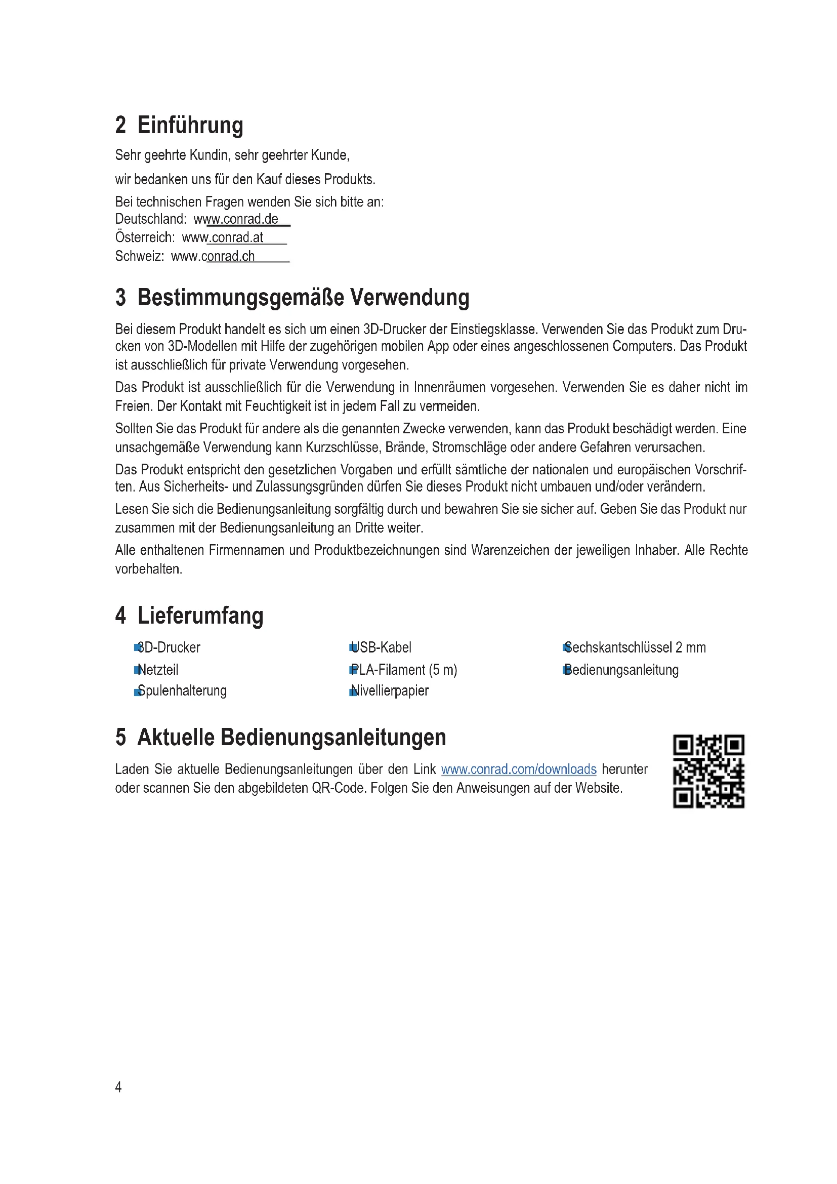 Bedienungsanleitung 5 Aktuelle Bedienungsanleitungen Laden Sie aktuelle Bedienungsanleitungen über den Link www.conrad.com/downloads herunter oder scannen Sie den abgebildeten QR-Code. Folgen Sie den Anweisungen auf der Website.5 6 Symbol-Erklärung Die folgenden Symbole benden sich am Produkt/Gerät oder erscheinen im Text: Dieses Symbol warnt vor Gefahren, die Verletzungen nach sich ziehen können. Dieses Symbol warnt vor gefährlicher Spannung, die zu Verletzungen durch einen Stromschlag führen kann. Das Symbol warnt vor heißen Oberächen, die bei Berührung zu schweren Verbrennungen führen können. Lesen Sie die Informationen sorgfältig. Lesen Sie die Bedienungsanleitung sorgfältig durch. Das Produkt darf nur in trockenen, geschlossenen Innenräumen verwendet werden. Es darf weder feucht noch nass werden. 7 Sicherheitshinweise Lesen Sie sich die Bedienungsanleitung sorgfältig durch und beachten Sie insbesondere die Sicherheitshinweise. Sollten Sie die in dieser Bedienungsanleitung aufgeführten Sicherheitshin- weise und Informationen für einen ordnungsgemäßen Gebrauch nicht beachten, übernehmen wir keine Haftung für daraus resultierende Personen- oder Sachschäden. Darüber hinaus erlischt in solchen Fällen die Gewährleistung/Garantie.