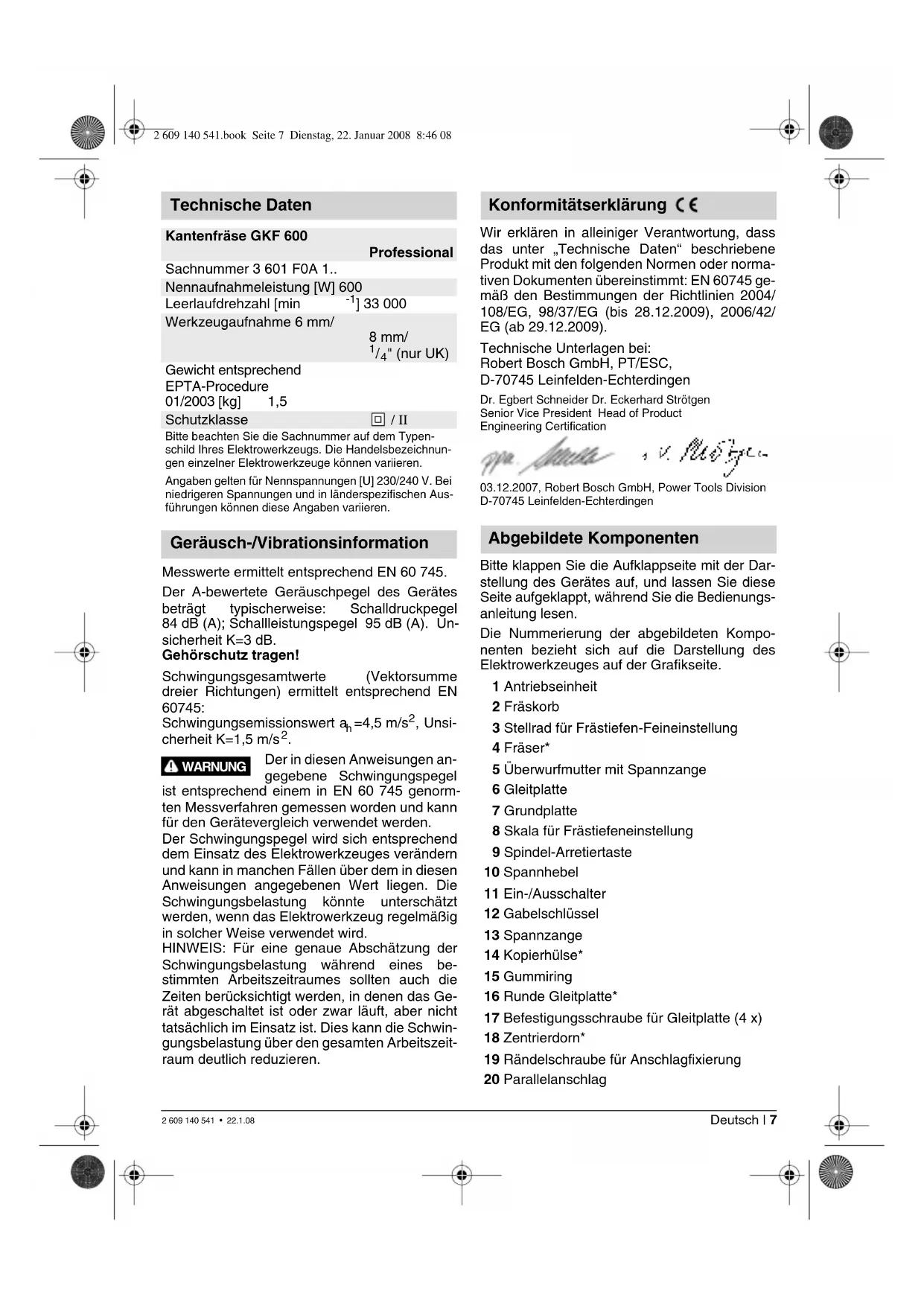 " (nur UK) Gewicht entsprechend EPTA-Procedure 01/2003 [kg] 1,5 Schutzklasse / II Bitte beachten Sie die Sachnummer auf dem Typen- schild Ihres Elektrowerkzeugs. Die Handelsbezeichnun- gen einzelner Elektrowerkzeuge können variieren. Angaben gelten für Nennspannungen [U] 230/240 V. Bei niedrigeren Spannungen und in länderspezifischen Aus- führungen können diese Angaben variieren. Geräusch-/Vibrationsinformation WARNUNG Konformitätserklärung Abgebildete Komponenten 2 609 140 541.book Seite 7 Dienstag, 22. Januar 2008 8:46 082 609 140 541 • 22.1.08 8 | Deutsch 21 Flügelschraube für Parallelanschlag 22 Führungshilfe 23 Flügelschraube für Horizontalausrichtung der Führungshilfe 24 Flügelschraube für Fixierung der Horizontalausrichtung 25 Fräskorbabdeckung* 26 Winkelfräskorb* 27 Flügelschraube für Winkelverstellung 28 Skala für Fräswinkelverstellung 29 Handgriff* 30 Absaughaube* 31 Absaugadapter* 32 Gleitplatte mit Handgriff und Absaugadapter*