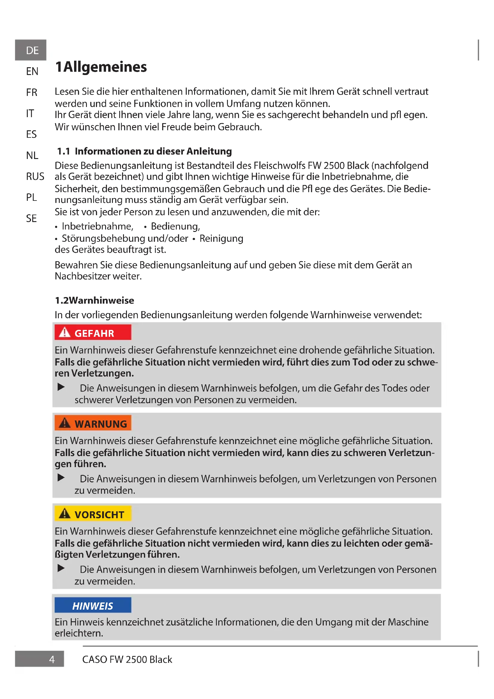 In der vorliegenden Bedienungsanleitung werden folgende Warnhinweise verwendet: Ein Warnhinweis dieser Gefahrenstufe kennzeichnet eine drohende gefährliche Situation. Falls die gefährliche Situation nicht vermieden wird, führt dies zum Tod oder zu schwe- ren Verletzungen. Die Anweisungen in diesem Warnhinweis befolgen, um die Gefahr des Todes oder schwerer Verletzungen von Personen zu vermeiden. Ein Warnhinweis dieser Gefahrenstufe kennzeichnet eine mögliche gefährliche Situation. Falls die gefährliche Situation nicht vermieden wird, kann dies zu schweren Verletzun- gen führen. Die Anweisungen in diesem Warnhinweis befolgen, um Verletzungen von Personen zu vermeiden. Ein Warnhinweis dieser Gefahrenstufe kennzeichnet eine mögliche gefährliche Situation. Falls die gefährliche Situation nicht vermieden wird, kann dies zu leichten oder gemä- ßigten Verletzungen führen. Die Anweisungen in diesem Warnhinweis befolgen, um Verletzungen von Personen zu vermeiden. Ein Hinweis kennzeichnet zusätzliche Informationen, die den Umgang mit der Maschine erleichtern. GEFAHR WARNUNG VORSICHT HINWEISCASO FW 2500 Black