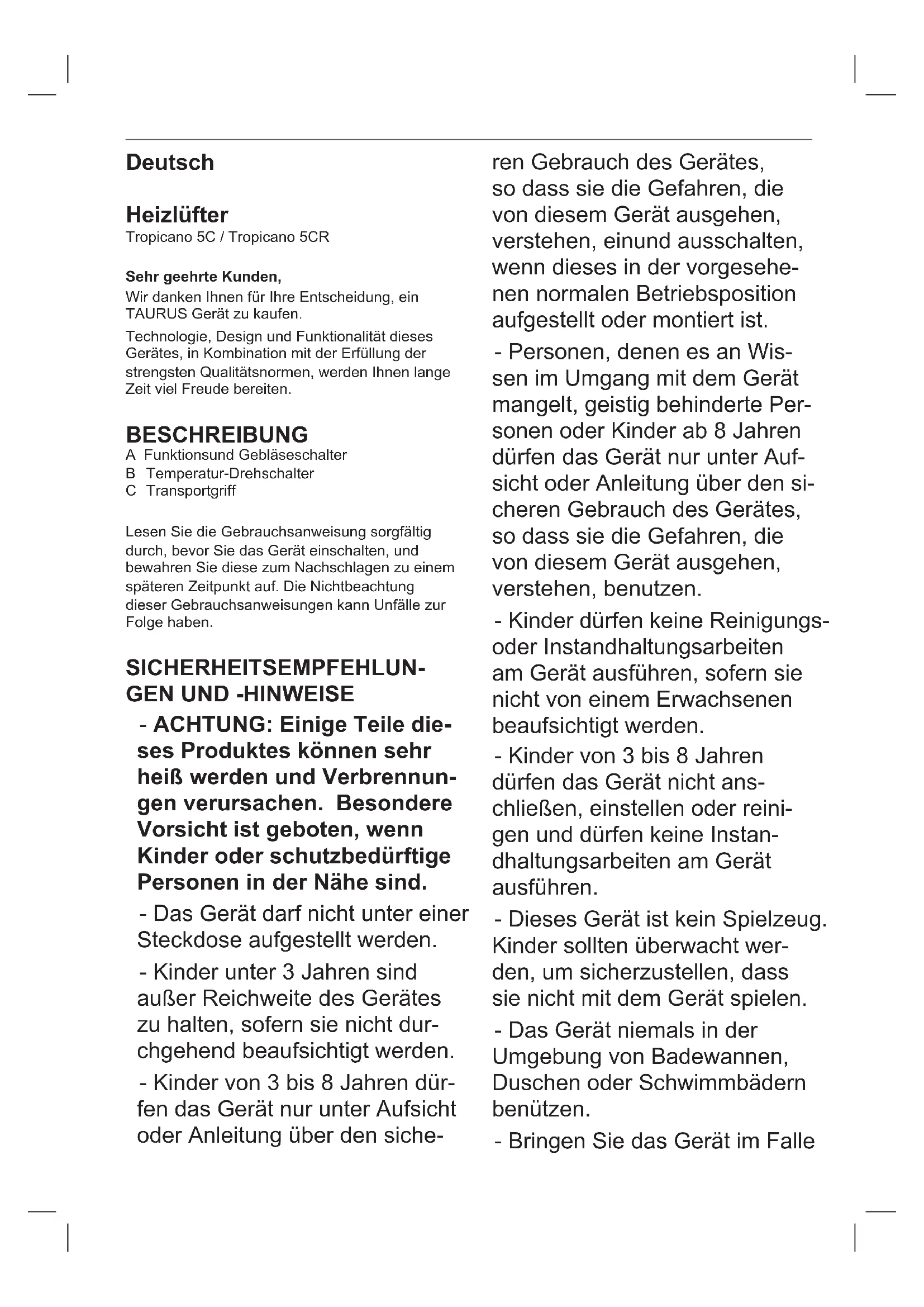 0 kW Nur bei elektrischen Speicher-Einzelraumheizgeräten: Art der Regelung der Wärmezufuhr manuelle Regelung der Wärmezufuhr mit integriertem Thermostat Nein Manuelle Regelung der Wärmezufuhr mit Rückmeldung der Rau- mund/ oder Außentemperatur Nein Elektronische Regelung der Wärmezufuhr mit Rückmeldung der Raumund/oder Außentemperatur Nein Wärmeabgabe mit Gebläseunterstützung Nein Art der Kontrolle der Wärmeleistung / Raumtemperatur Einstuge Wärmeleistung, keine Raumtemperaturkontrolle Nein Zwei oder mehr manuell einstellbare Stufen, keine Raumtempera- turkontrolle Nein Raumtemperaturkontrolle mittels eines mechanischen Thermostats Ja Mit elektronischer Raumtemperaturkontrolle Nein Mit elektronischer Raumtemperaturkontrolle und Tageszeitregler Nein Mit elektronischer Raumtemperaturkontrolle und Wochentagsregelung Nein Andere Kontrolloptionen Raumtemperaturkontrolle mit Präsenzerkennung Nein Raumtemperaturkontrolle mit Erkennung offener Fenster Nein Mit Fernbedienungsoption Nein Mit adaptiver Regelung des Heizbeginns Nein Mit Betriebszeitbegrenzung Nein Mit Schwarzkugelsensor Nein Kontakt "ELECTRODOMÉSTICOS TAURUS, S.L. Avda. Barcelona S/N 25790 Oliana, Lleida, Spain”Italiano Ventilatore riscaldatore Tropicano 5C / Tropicano 5CR Gentile Cliente, Le siamo grati per aver acquistato un elettrodo- mestico della marca TAURUS. La sua tecnologia, il suo design e la sua funziona- lità, oltre al fatto di aver superato le più rigorose norme di qualità, le assicureranno una totale soddisfazione durante molto tempo. DESCRIZIONE A Selettore di funzione e velocità B Manopola del termostato C Maniglia/e di Trasporto Prima di utilizzare l’apparecchio, leggere attenta- mente le istruzioni riportate nel presente opuscolo e conservarlo per future consultazioni. La manca- ta osservanza delle presenti istruzioni può essere causa di incidenti.