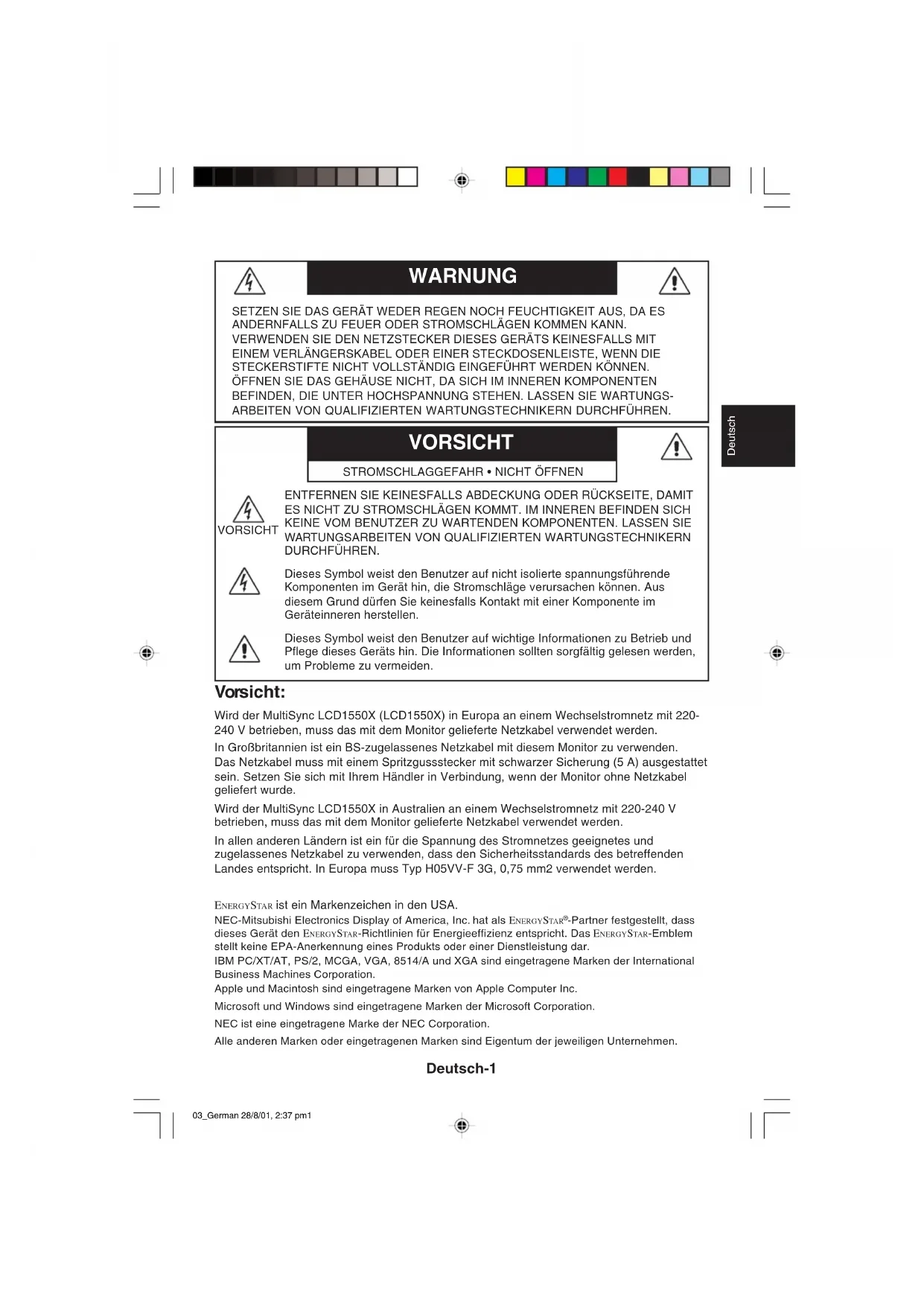 Vorsicht: Wird der MultiSync LCD1550X (LCD1550X) in Europa an einem Wechselstromnetz mit 220- 240 V betrieben, muss das mit dem Monitor gelieferte Netzkabel verwendet werden. In Großbritannien ist ein BS-zugelassenes Netzkabel mit diesem Monitor zu verwenden. Das Netzkabel muss mit einem Spritzgussstecker mit schwarzer Sicherung (5 A) ausgestattet sein. Setzen Sie sich mit Ihrem Händler in Verbindung, wenn der Monitor ohne Netzkabel geliefert wurde. Wird der MultiSync LCD1550X in Australien an einem Wechselstromnetz mit 220-240 V betrieben, muss das mit dem Monitor gelieferte Netzkabel verwendet werden. In allen anderen Ländern ist ein für die Spannung des Stromnetzes geeignetes und zugelassenes Netzkabel zu verwenden, dass den Sicherheitsstandards des betreffenden Landes entspricht. In Europa muss Typ H05VV-F 3G, 0,75 mm2 verwendet werden. ENERGYSTA R ist ein Markenzeichen in den USA. NEC-Mitsubishi Electronics Display of America, Inc. hat als ENERGYSTA R