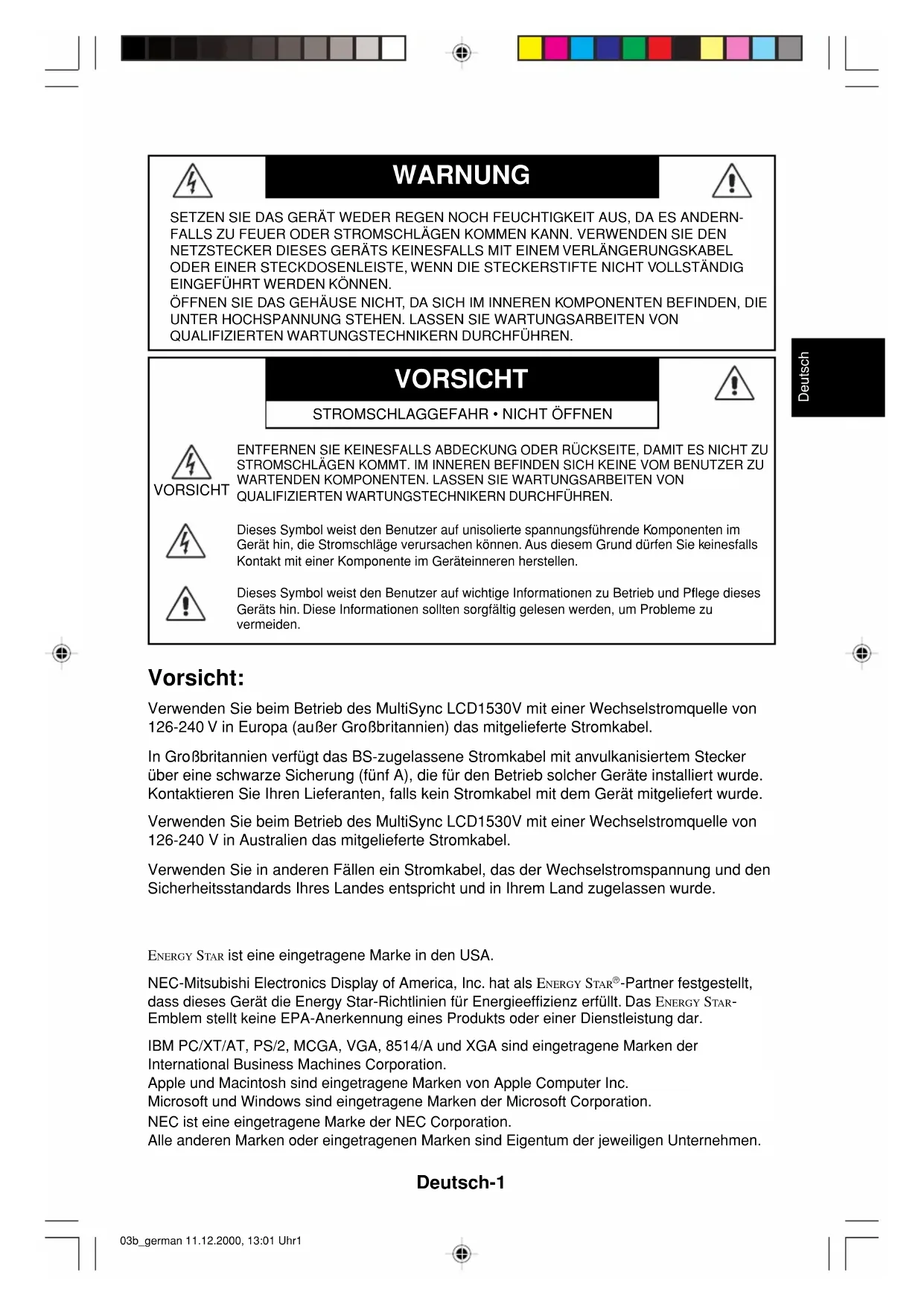 -Partner festgestellt, dass dieses Gerät die Energy Star-Richtlinien für Energieeffizienz erfüllt. Das ENERGY STA R - Emblem stellt keine EPA-Anerkennung eines Produkts oder einer Dienstleistung dar. IBM PC/XT/AT, PS/2, MCGA, VGA, 8514/A und XGA sind eingetragene Marken der International Business Machines Corporation. Apple und Macintosh sind eingetragene Marken von Apple Computer Inc. Microsoft und Windows sind eingetragene Marken der Microsoft Corporation. NEC ist eine eingetragene Marke der NEC Corporation. Alle anderen Marken oder eingetragenen Marken sind Eigentum der jeweiligen Unternehmen. Vorsicht: Verwenden Sie beim Betrieb des MultiSync LCD1530V mit einer Wechselstromquelle von 126-240 V in Europa (außer Großbritannien) das mitgelieferte Stromkabel. In Großbritannien verfügt das BS-zugelassene Stromkabel mit anvulkanisiertem Stecker über eine schwarze Sicherung (fünf A), die für den Betrieb solcher Geräte installiert wurde. Kontaktieren Sie Ihren Lieferanten, falls kein Stromkabel mit dem Gerät mitgeliefert wurde. Verwenden Sie beim Betrieb des MultiSync LCD1530V mit einer Wechselstromquelle von 126-240 V in Australien das mitgelieferte Stromkabel. Verwenden Sie in anderen Fällen ein Stromkabel, das der Wechselstromspannung und den Sicherheitsstandards Ihres Landes entspricht und in Ihrem Land zugelassen wurde. 03b_german 11.12.2000, 13:01 Uhr1Deutsch-2 Erklärung Erklärung des Herstellers Wir bestätigen hiermit, dass der Farbmonitor MultiSync LCD1530V (LA-15R01) den folgenden Richtlinien entspricht: EG-Direktive 73/23/EG: - EN 60950 EG-Direktive 89/336/EG: - EN 55022 - EN 61000-3-2 - EN 61000-3-3 - EN 55024 und mit folgendem Siegel gekennzeichnet ist: NEC-Mitsubishi Electric Visual Systems, Corp.