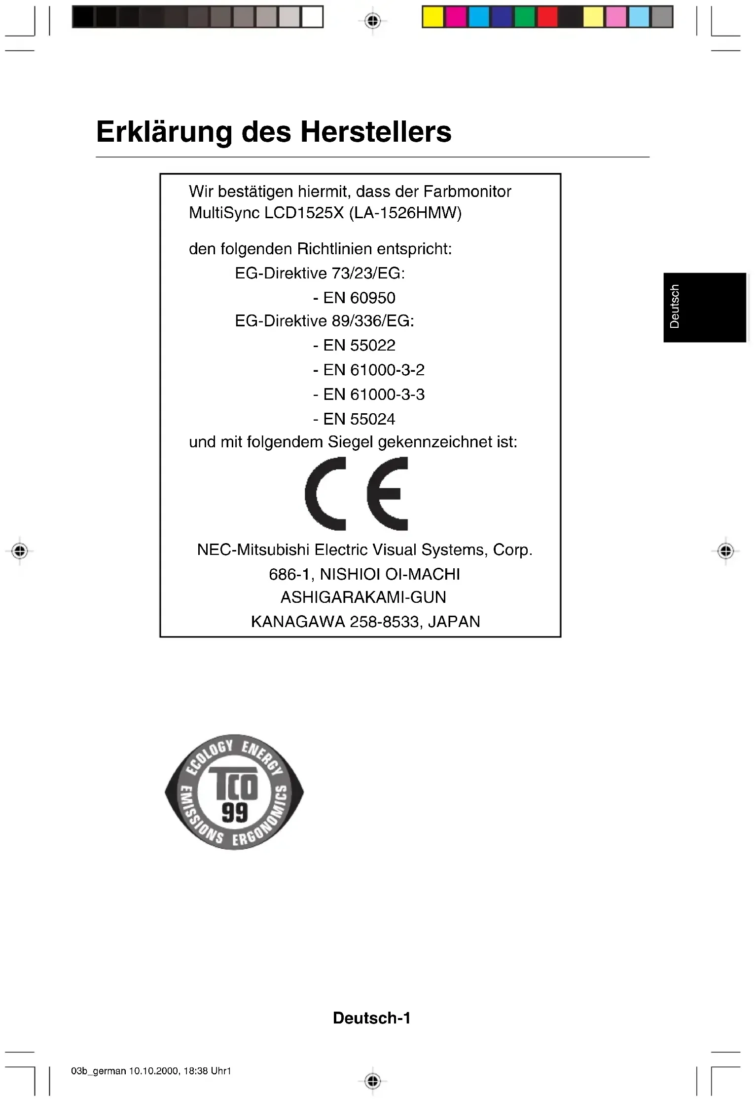 03b_german 10.10.2000, 18:38 Uhr1Deutsch-2 Inhalt Der Karton mit Ihrem neuen NEC MultiSync LCD-Monitor sollte folgende Komponenten enthalten: – NEC MultiSync LCD1525X – Netzkabel – DVI-A-auf-VGA-Kabel – DVI-D-auf-DVI-D-Videosignalkabel – USB-Kabel – CD-ROM (enthält die vollständige Bedienungsanleitung im PDF-Format und weitere Dateien, wie etwa die INF-Datei und Farbprofile). Um das Handbuch anzeigen und drucken zu können, muss auf dem Computer Acrobat Reader 4.0 installiert sein. – Bedienungsanleitung Bewahren Sie den Originalkarton und das Verpackungsmaterial für spätere Transporte des Monitors auf.