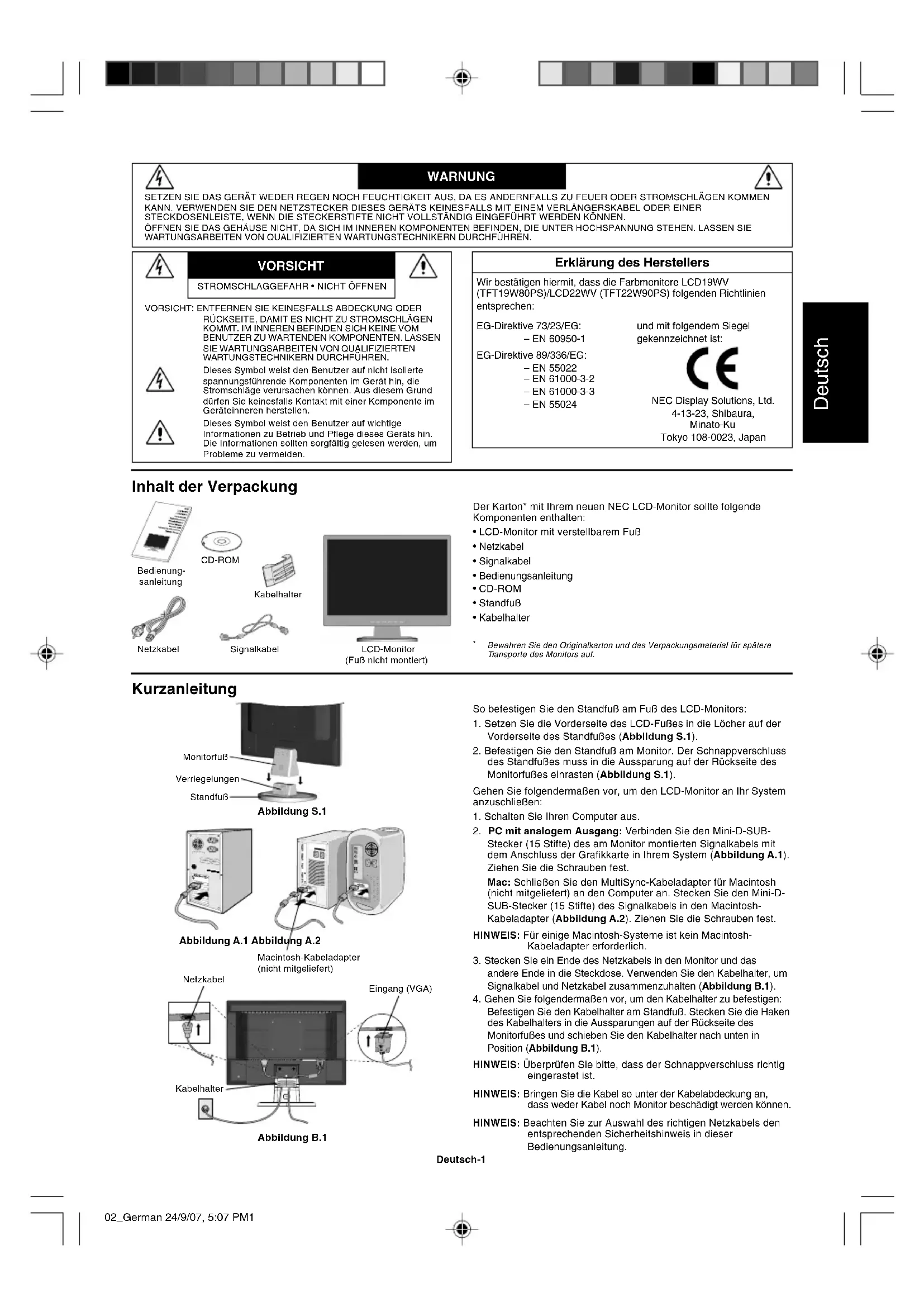 Setzt alle Funktionen auf die Werte der automatischen Einstellung zurück. Nein Führt keine automatische Zurücksetzung durch, kehrt zum Hauptmenü zurück. Exit Beendet OSD. OSD-Meldung: Automatische Konfiguration – bitte warten Wenn der Benutzer die Abkürzungstaste „Auto“ drückt, wird diese Meldung angezeigt. Der Monitor wird daraufhin automatisch konfiguriert. Diese Nachricht finden Sie in den Positionseinstellungen im Menüpunkt „OSD-Einstellung“. Eingangssignal nicht unterstützt Diese Meldung wird angezeigt, wenn die Hsync-Frequenz, Vsync- Frequenz oder Auflösung zu hoch eingestellt sind. Diese Meldung erscheint als schwebende Meldung auf Ihrem Monitor. Kabel nicht angeschlossen Diese Meldung wird angezeigt, wenn das Videokabel nicht angeschlossen ist. Diese Meldung erscheint als schwebende Meldung auf Ihrem Monitor. Nach 5 Sekunden wechselt der Monitor in den Energiesparmodus. Kein Signal Wenn das Videokabel angeschlossen ist, es aber kein aktives Eingangssignal gibt, wird diese Meldung, nachdem der Monitor in den Energiesparmodus gewechselt ist, fünf Sekunden später angezeigt. Diese Nachricht finden Sie in den Positionseinstellungen im Menüpunkt „OSD-Einstellung“. OSD gesperrt Wenn OSD entsperrt ist, halten Sie die Menütaste gedrückt und drücken Sie einmal auf die Einschalttaste, um den Monitor einzuschalten. OSD wird gesperrt und diese Meldung angezeigt. Wenn OSD gesperrt ist, kann nur die Einschalttaste verwendet werden. Wenn Sie auf eine der anderen Tasten drücken, wird diese Meldung angezeigt. Wenn OSD gesperrt ist, halten Sie die Menütaste gedrückt und drücken Sie einmal auf die Einschalttaste, um den Monitor einzuschalten. OSD wird entsperrt und keine Meldung angezeigt. Diese Nachricht finden Sie in den Positionseinstellungen im Menüpunkt „OSD-Einstellung“. DDCCI gesperrt/freigegeben Wenn DDCCI freigegeben ist, drücken Sie auf die Abkürzungstaste „Auto“. Nach fünf Sekunden wird die Meldung „DDCCI gesperrt“ auf dem Monitor angezeigt. Wenn DDCCI gesperrt ist, drücken Sie auf die Abkürzungstaste „Auto“. Nach fünf Sekunden wird die Meldung „DDCCI freigegeben“ auf dem Monitor angezeigt. Diese Nachricht finden Sie in den Positionseinstellungen im Menüpunkt „OSD-Einstellung“. 02_German 24/9/07, 5:07 PM4Español-1 Español RIESGO DE DESCARGAS ELÉCTRICAS • NO ABRIR PARA PREVENIR EL PELIGRO DE INCENDIO O DESCARGAS ELÉCTRICAS, NO EXPONGA ESTE PRODUCTO A LA LLUVIA O LA HUMEDAD. TAMPOCO UTILICE EL ENCHUFE POLARIZADO DE ESTE PRODUCTO CON UN RECEPTÁCULO DEL CABLE DE EXTENSIÓN U OTRAS TOMAS A MENOS QUE LAS PROLONGACIONES SE PUEDAN INSERTAR COMPLETAMENTE.NO ABRA LA CAJA DEL MONITOR, YA QUE CONTIENE COMPONENTES DE ALTO VOLTAJE. DEJE QUE SEA EL PERSONAL DE SERVICIOCUALIFICADO QUIEN SE ENCARGUE DE LAS TAREAS DE SERVICIO. ADVERTENCIA PELIGRO: PARA REDUCIR EL RIESGO DE DESCARGASELÉCTRICAS, NO RETIRE LA CUBIERTA (O LA PARTEPOSTERIOR). EL MONITOR NO CONTIENE PIEZAS QUEDEBA MANIPULAR EL USUARIO. DEJE QUE SEA ELPERSONAL DE SERVICIO CUALIFICADO QUIEN SEENCARGUE DE LAS TAREAS DE SERVICIO.Este símbolo advierte al usuario de que el producto puedecontener suficiente voltaje sin aislar como paracausar descargas eléctricas. Por tanto, evite el contacto concualquier pieza del interior del monitor.Este símbolo advierte al usuario de que se incluyedocumentación importante respecto al funcionamiento y elmantenimiento de este producto. Por ello, debería leerlaatentamente para evitar problemas. PELIGRO Declaración del fabricante Por la presente certificamos que los monitores en color LCD19WV (TFT19W80PS)/LCD22WV (TFT22W90PS) cumplen la y lleva la marca NEC Display Solutions, Ltd. 4-13-23, Shibaura, Minato-Ku Tokyo 108-0023, Japón Directiva 73/23/CEE: – EN 60950-1 Directiva 89/336/CEE: – EN 55022 – EN 61000-3-2 – EN 61000-3-3 – EN 55024 Contenido Su nueva caja* de monitor LCD NEC debería contener: