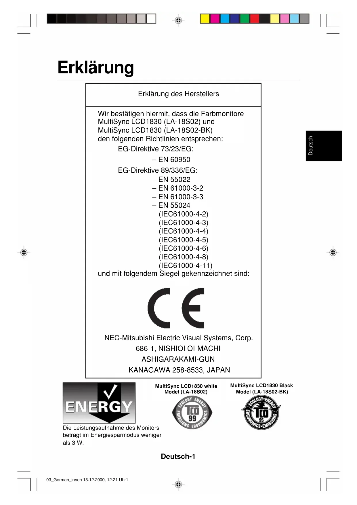 Die Leistungsaufnahme des Monitors beträgt im Energiesparmodus weniger als 3 W. MultiSync LCD1830 white Model (LA-18S02) MultiSync LCD1830 Black Model (LA-18S02-BK) 03_German_innen 13.12.2000, 12:21 Uhr1Deutsch-2 Inhalt Der Karton* mit Ihrem neuen NEC MultiSync LCD-Monitor sollte folgende Komponenten enthalten: