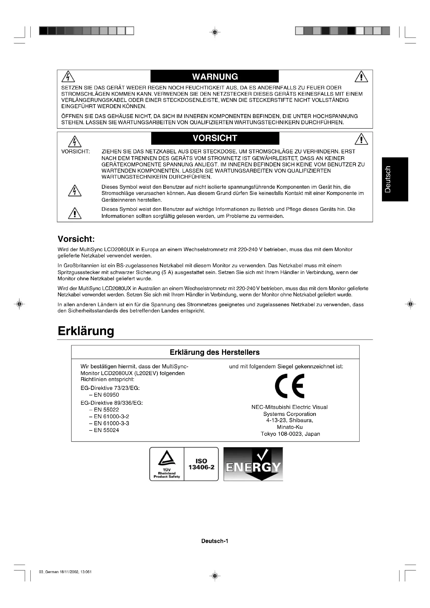 - NepouÏívejte primární modrou barvu na tmavém pozadí; je ‰patnû vidût a zpÛsobuje únavu oãí v dÛsledku nedostateãného kontrastu. 02_Czech 18/11/2002, 13:0610Deutsch Deutsch-1 WARNUNG SETZEN SIE DAS GERÄT WEDER REGEN NOCH FEUCHTIGKEIT AUS, DA ES ANDERNFALLS ZU FEUER ODER STROMSCHLÄGEN KOMMEN KANN. VERWENDEN SIE DEN NETZSTECKER DIESES GERÄTS KEINESFALLS MIT EINEM VERLÄNGERUNGSKABEL ODER EINER STECKDOSENLEISTE, WENN DIE STECKERSTIFTE NICHT VOLLSTÄNDIG EINGEFÜHRT WERDEN KÖNNEN. ÖFFNEN SIE DAS GEHÄUSE NICHT, DA SICH IM INNEREN KOMPONENTEN BEFINDEN, DIE UNTER HOCHSPANNUNG STEHEN. LASSEN SIE WARTUNGSARBEITEN VON QUALIFIZIERTEN WARTUNGSTECHNIKERN DURCHFÜHREN. VORSICHT VORSICHT: ZIEHEN SIE DAS NETZKABEL AUS DER STECKDOSE, UM STROMSCHLÄGE ZU VERHINDERN. ERST NACH DEM TRENNEN DES GERÄTS VOM STROMNETZ IST GEWÄHRLEISTET, DASS AN KEINER GERÄTEKOMPONENTE SPANNUNG ANLIEGT. IM INNEREN BEFINDEN SICH KEINE VOM BENUTZER ZU WARTENDEN KOMPONENTEN. LASSEN SIE WARTUNGSARBEITEN VON QUALIFIZIERTEN WARTUNGSTECHNIKERN DURCHFÜHREN. Dieses Symbol weist den Benutzer auf nicht isolierte spannungsführende Komponenten im Gerät hin, die Stromschläge verursachen können. Aus diesem Grund dürfen Sie keinesfalls Kontakt mit einer Komponente im Geräteinneren herstellen. Dieses Symbol weist den Benutzer auf wichtige Informationen zu Betrieb und Pflege dieses Geräts hin. Die Informationen sollten sorgfältig gelesen werden, um Probleme zu vermeiden. Vorsicht: Wird der MultiSync LCD2080UX in Europa an einem Wechselstromnetz mit 220-240 V betrieben, muss das mit dem Monitor gelieferte Netzkabel verwendet werden. In Großbritannien ist ein BS-zugelassenes Netzkabel mit diesem Monitor zu verwenden. Das Netzkabel muss mit einem Spritzgussstecker mit schwarzer Sicherung (5 A) ausgestattet sein. Setzen Sie sich mit Ihrem Händler in Verbindung, wenn der Monitor ohne Netzkabel geliefert wurde. Wird der MultiSync LCD2080UX in Australien an einem Wechselstromnetz mit 220-240 V betrieben, muss das mit dem Monitor gelieferte Netzkabel verwendet werden. Setzen Sie sich mit Ihrem Händler in Verbindung, wenn der Monitor ohne Netzkabel geliefert wurde. In allen anderen Ländern ist ein für die Spannung des Stromnetzes geeignetes und zugelassenes Netzkabel zu verwenden, dass den Sicherheitsstandards des betreffenden Landes entspricht. Erklärung Erklärung des Herstellers Wir bestätigen hiermit, dass der MultiSync- Monitor LCD2080UX (L202EV) folgenden Richtlinien entspricht: EG-Direktive 73/23/EG: – EN 60950 EG-Direktive 89/336/EG: – EN 55022 – EN 61000-3-2 – EN 61000-3-3 – EN 55024 und mit folgendem Siegel gekennzeichnet ist: NEC-Mitsubishi Electric Visual Systems Corporation 4-13-23, Shibaura, Minato-Ku Tokyo 108-0023, Japan 03_German 18/11/2002, 13:061Deutsch-2 Inhalt der Verpackung Der Karton* mit Ihrem neuen NEC MultiSync LCD-Monitor sollte folgende Komponenten enthalten: