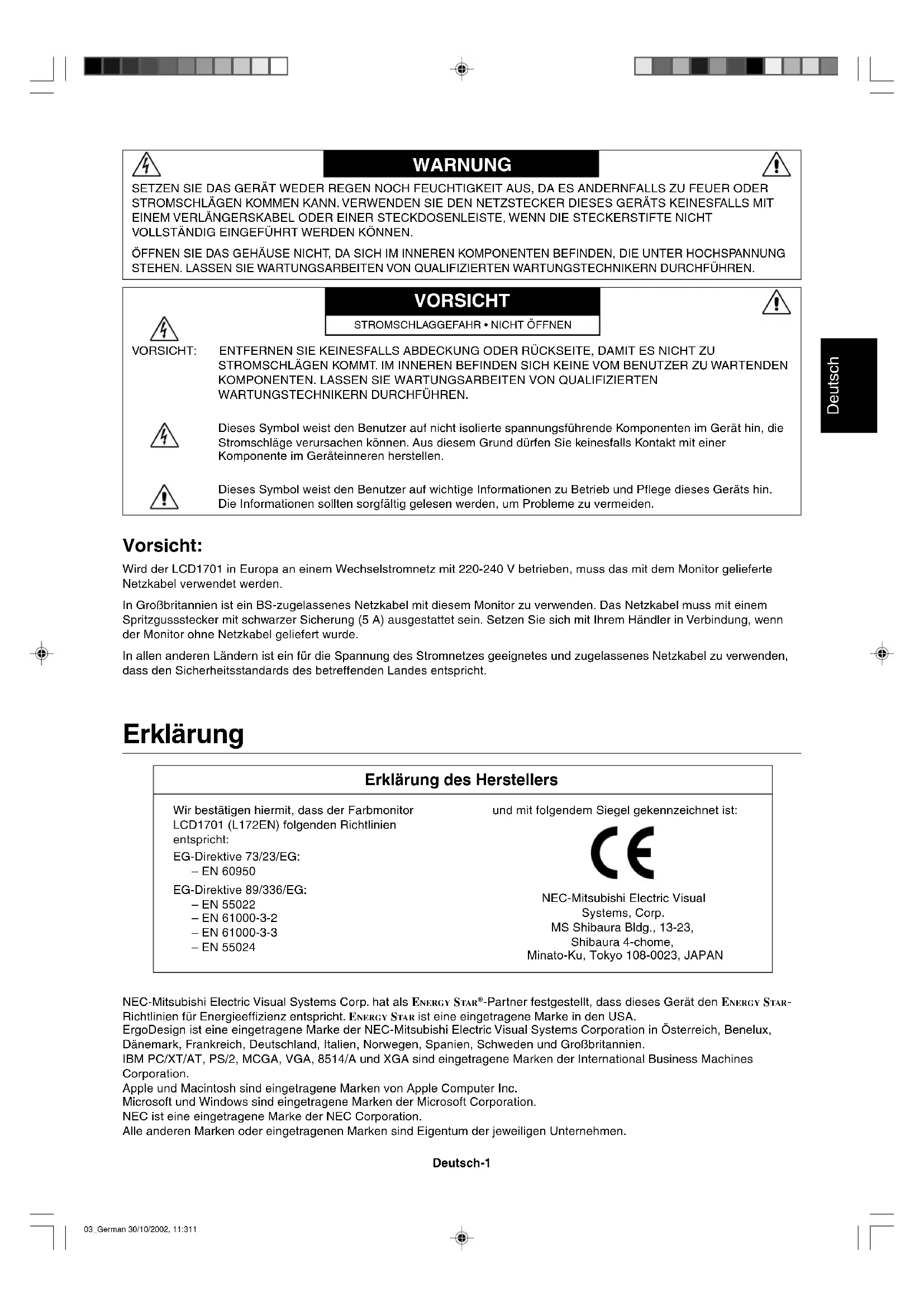 -Partner festgestellt, dass dieses Gerät den ENERGY STAR - Richtlinien für Energieeffizienz entspricht. ENERGY STA R ist eine eingetragene Marke in den USA. ErgoDesign ist eine eingetragene Marke der NEC-Mitsubishi Electric Visual Systems Corporation in Österreich, Benelux, Dänemark, Frankreich, Deutschland, Italien, Norwegen, Spanien, Schweden und Großbritannien. IBM PC/XT/AT, PS/2, MCGA, VGA, 8514/A und XGA sind eingetragene Marken der International Business Machines Corporation. Apple und Macintosh sind eingetragene Marken von Apple Computer Inc. Microsoft und Windows sind eingetragene Marken der Microsoft Corporation. NEC ist eine eingetragene Marke der NEC Corporation. Alle anderen Marken oder eingetragenen Marken sind Eigentum der jeweiligen Unternehmen. Wir bestätigen hiermit, dass der Farbmonitor LCD1701 (L172EN) folgenden Richtlinien entspricht: EG-Direktive 73/23/EG: – EN 60950 EG-Direktive 89/336/EG: – EN 55022 – EN 61000-3-2 – EN 61000-3-3 – EN 55024 und mit folgendem Siegel gekennzeichnet ist: NEC-Mitsubishi Electric Visual Systems, Corp. MS Shibaura Bldg., 13-23, Shibaura 4-chome, Minato-Ku, Tokyo 108-0023, JAPAN Vorsicht: Wird der LCD1701 in Europa an einem Wechselstromnetz mit 220-240 V betrieben, muss das mit dem Monitor gelieferte Netzkabel verwendet werden. In Großbritannien ist ein BS-zugelassenes Netzkabel mit diesem Monitor zu verwenden. Das Netzkabel muss mit einem Spritzgussstecker mit schwarzer Sicherung (5 A) ausgestattet sein. Setzen Sie sich mit Ihrem Händler in Verbindung, wenn der Monitor ohne Netzkabel geliefert wurde. In allen anderen Ländern ist ein für die Spannung des Stromnetzes geeignetes und zugelassenes Netzkabel zu verwenden, dass den Sicherheitsstandards des betreffenden Landes entspricht. SETZEN SIE DAS GERÄT WEDER REGEN NOCH FEUCHTIGKEIT AUS, DA ES ANDERNFALLS ZU FEUER ODER STROMSCHLÄGEN KOMMEN KANN. VERWENDEN SIE DEN NETZSTECKER DIESES GERÄTS KEINESFALLS MIT EINEM VERLÄNGERSKABEL ODER EINER STECKDOSENLEISTE, WENN DIE STECKERSTIFTE NICHT VOLLSTÄNDIG EINGEFÜHRT WERDEN KÖNNEN. ÖFFNEN SIE DAS GEHÄUSE NICHT, DA SICH IM INNEREN KOMPONENTEN BEFINDEN, DIE UNTER HOCHSPANNUNG STEHEN. LASSEN SIE WARTUNGSARBEITEN VON QUALIFIZIERTEN WARTUNGSTECHNIKERN DURCHFÜHREN. WARNUNG VORSICHT VORSICHT: ENTFERNEN SIE KEINESFALLS ABDECKUNG ODER RÜCKSEITE, DAMIT ES NICHT ZU STROMSCHLÄGEN KOMMT. IM INNEREN BEFINDEN SICH KEINE VOM BENUTZER ZU WARTENDEN