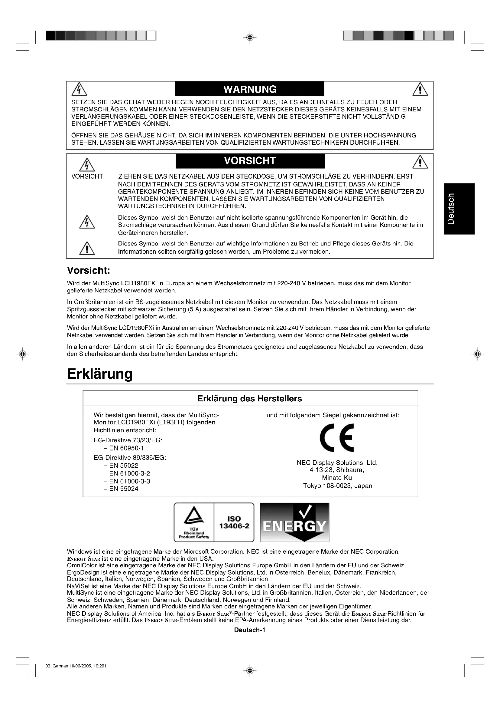 - NepouÏívejte primární modrou barvu na tmavém pozadí; je ‰patnû vidût a zpÛsobuje únavu oãí v dÛsledku nedostateãného kontrastu. 02_Czech 10/06/2005, 10:2911âesky-12 02_Czech 10/06/2005, 10:2912Deutsch Deutsch-1 WARNUNG SETZEN SIE DAS GERÄT WEDER REGEN NOCH FEUCHTIGKEIT AUS, DA ES ANDERNFALLS ZU FEUER ODER STROMSCHLÄGEN KOMMEN KANN. VERWENDEN SIE DEN NETZSTECKER DIESES GERÄTS KEINESFALLS MIT EINEM VERLÄNGERUNGSKABEL ODER EINER STECKDOSENLEISTE, WENN DIE STECKERSTIFTE NICHT VOLLSTÄNDIG EINGEFÜHRT WERDEN KÖNNEN. ÖFFNEN SIE DAS GEHÄUSE NICHT, DA SICH IM INNEREN KOMPONENTEN BEFINDEN, DIE UNTER HOCHSPANNUNG STEHEN. LASSEN SIE WARTUNGSARBEITEN VON QUALIFIZIERTEN WARTUNGSTECHNIKERN DURCHFÜHREN. VORSICHT VORSICHT: ZIEHEN SIE DAS NETZKABEL AUS DER STECKDOSE, UM STROMSCHLÄGE ZU VERHINDERN. ERST NACH DEM TRENNEN DES GERÄTS VOM STROMNETZ IST GEWÄHRLEISTET, DASS AN KEINER GERÄTEKOMPONENTE SPANNUNG ANLIEGT. IM INNEREN BEFINDEN SICH KEINE VOM BENUTZER ZU WARTENDEN KOMPONENTEN. LASSEN SIE WARTUNGSARBEITEN VON QUALIFIZIERTEN WARTUNGSTECHNIKERN DURCHFÜHREN. Dieses Symbol weist den Benutzer auf nicht isolierte spannungsführende Komponenten im Gerät hin, die Stromschläge verursachen können. Aus diesem Grund dürfen Sie keinesfalls Kontakt mit einer Komponente im Geräteinneren herstellen. Dieses Symbol weist den Benutzer auf wichtige Informationen zu Betrieb und Pflege dieses Geräts hin. Die Informationen sollten sorgfältig gelesen werden, um Probleme zu vermeiden. Vorsicht: Wird der MultiSync LCD1980FXi in Europa an einem Wechselstromnetz mit 220-240 V betrieben, muss das mit dem Monitor gelieferte Netzkabel verwendet werden. In Großbritannien ist ein BS-zugelassenes Netzkabel mit diesem Monitor zu verwenden. Das Netzkabel muss mit einem Spritzgussstecker mit schwarzer Sicherung (5 A) ausgestattet sein. Setzen Sie sich mit Ihrem Händler in Verbindung, wenn der Monitor ohne Netzkabel geliefert wurde. Wird der MultiSync LCD1980FXi in Australien an einem Wechselstromnetz mit 220-240 V betrieben, muss das mit dem Monitor gelieferte Netzkabel verwendet werden. Setzen Sie sich mit Ihrem Händler in Verbindung, wenn der Monitor ohne Netzkabel geliefert wurde. In allen anderen Ländern ist ein für die Spannung des Stromnetzes geeignetes und zugelassenes Netzkabel zu verwenden, dass den Sicherheitsstandards des betreffenden Landes entspricht. Erklärung Erklärung des Herstellers Wir bestätigen hiermit, dass der MultiSync- Monitor LCD1980FXi (L193FH) folgenden Richtlinien entspricht: EG-Direktive 73/23/EG: – EN 60950-1 EG-Direktive 89/336/EG: – EN 55022 – EN 61000-3-2 – EN 61000-3-3 – EN 55024 und mit folgendem Siegel gekennzeichnet ist: NEC Display Solutions, Ltd. 4-13-23, Shibaura, Minato-Ku Tokyo 108-0023, Japan Windows ist eine eingetragene Marke der Microsoft Corporation. NEC ist eine eingetragene Marke der NEC Corporation.