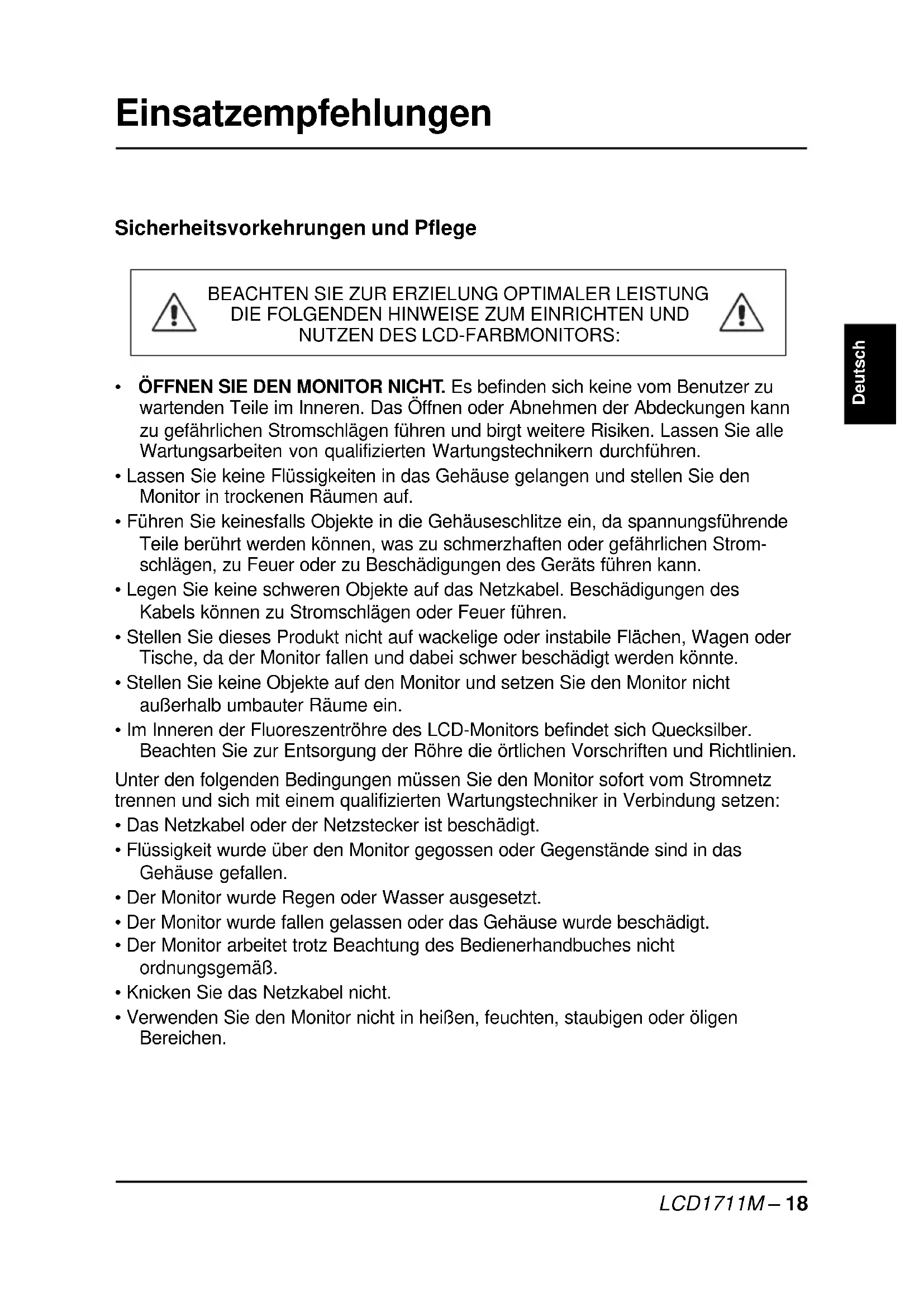 NUTZEN DES LCD-FARBMONITORS:19 – Bedienerhandbuch Deutsch