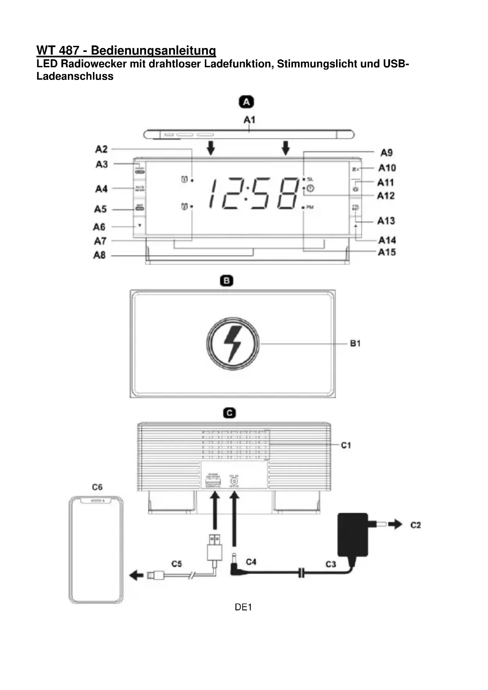 - Stellen Sie sicher, dass Ihr Radiowecker mit dem im Lieferumfang deses enthaltenen Netzteil (5V-2,5A) verbunden ist. Nicht autorisierte Ladegeräte oder Adapter können Schaden verursachen oder eine Fehlfunktion des drahtlosen Ladegeräts verursachen.