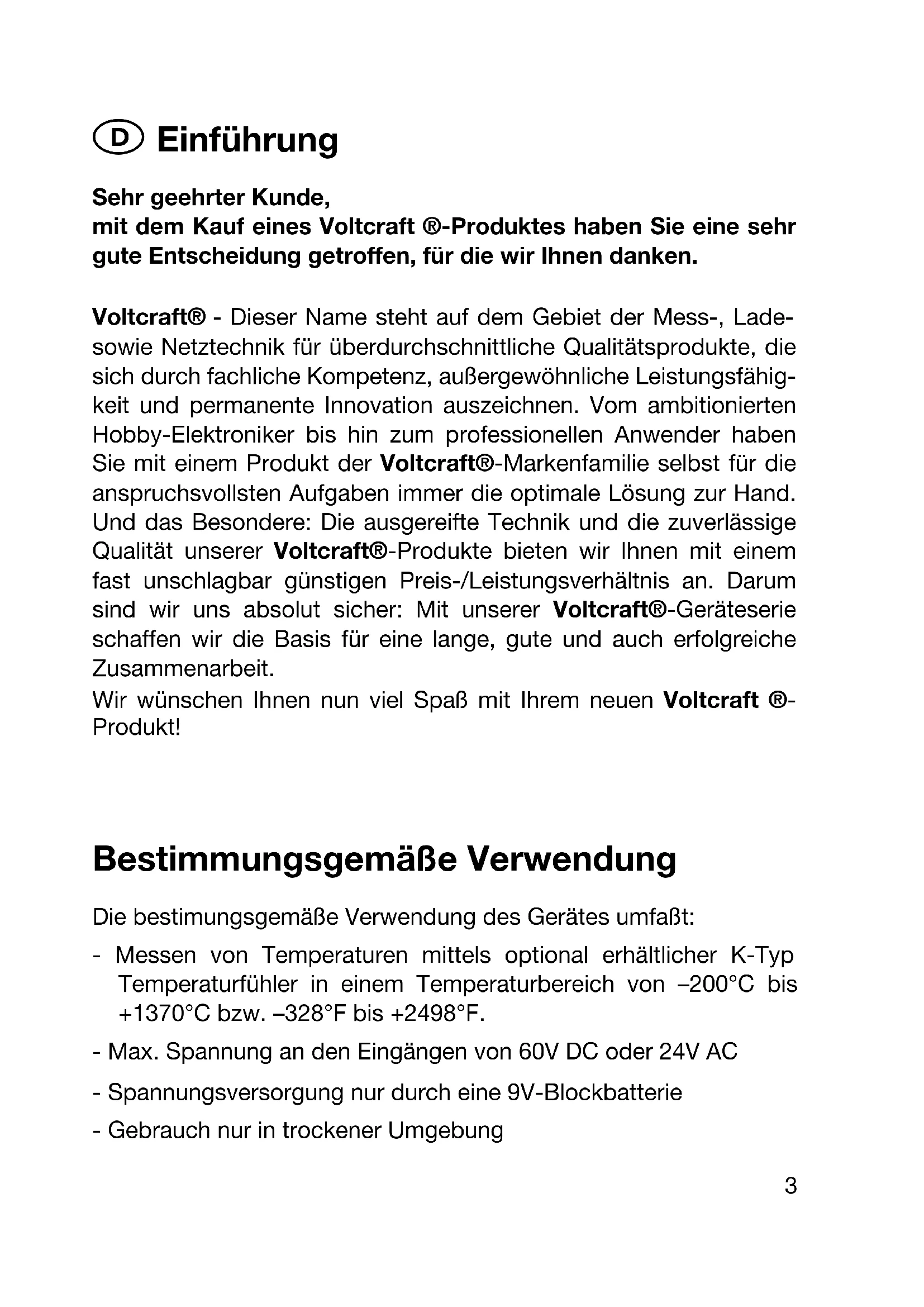 Einführung Sehr geehrter Kunde, mit dem Kauf eines Voltcraft ®-Produktes haben Sie eine sehr gute Entscheidung getroffen, für die wir Ihnen danken. Voltcraft® - Dieser Name steht auf dem Gebiet der Mess-, Lade- sowie Netztechnik für überdurchschnittliche Qualitätsprodukte, die sich durch fachliche Kompetenz, außergewöhnliche Leistungsfähig- keit und permanente Innovation auszeichnen. Vom ambitionierten Hobby-Elektroniker bis hin zum professionellen Anwender haben Sie mit einem Produkt der Voltcraft®-Markenfamilie selbst für die anspruchsvollsten Aufgaben immer die optimale Lösung zur Hand. Und das Besondere: Die ausgereifte Technik und die zuverlässige Qualität unserer Voltcraft®-Produkte bieten wir Ihnen mit einem fast unschlagbar günstigen Preis-/Leistungsverhältnis an. Darum sind wir uns absolut sicher: Mit unserer Voltcraft®-Geräteserie schaffen wir die Basis für eine lange, gute und auch erfolgreiche Zusammenarbeit. Wir wünschen Ihnen nun viel Spaß mit Ihrem neuen Voltcraft ®- Produkt! Bestimmungsgemäße Verwendung Die bestimungsgemäße Verwendung des Gerätes umfaßt: - Messen von Temperaturen mittels optional erhältlicher K-Typ Temperaturfühler in einem Temperaturbereich von –200°C bis +1370°C bzw. –328°F bis +2498°F. - Max. Spannung an den Eingängen von 60V DC oder 24V AC - Spannungsversorgung nur durch eine 9V-Blockbatterie - Gebrauch nur in trockener Umgebung 3Eine andere Verwendung als zuvor beschrieben führt zur Beschädigung dieses Produktes, darüber hinaus ist dies mit Gefahren, wie z.B. Kurzschluß, Brand, elektri- scher Schlag etc. verbunden. Das gesamte Produkt darf nicht geändert bzw. umgebaut und das Gehäuse nicht geöffnet werden! Die Sicherheitshinweise sind unbedingt zu beachten! Sicherheitshinweise Bei Schäden, die durch Nichtbeachten dieser Bedie- nungsanleitung verursacht werden, erlischt der Garantieanspruch! Für Folgeschäden übernehmen wir keine Haftung! Ein in einem Dreieck befindliches Ausrufezeichen weist auf wichtige Hinweise in der Bedienungsanlei- tung hin. Lesen Sie vor Inbetriebnahme die Anlei- tung komplett durch. Aus Sicherheits- und Zulassungsgründen (CE) ist das eigenmächtige Umbauen und/oder Verändern des Handthermometers nicht gestattet. Überschreiten Sie niemals die maximalen Eingangsgrößen. In gewerblichen Einrichtungen sind die Unfallverhütungsvorschriften des Verbandes der gewerblichen Berufsgenossenschaften für elek- trische Anlagen und Betriebsmittel zu beachten. Das Gerät gehört nicht in Kinderhände. Sollten sich Fragen ergeben, die nicht durch diese Bedienungsanlei- tung beantwortet werden können, setzen Sie sich mit einem Fach- mann oder unserer Kundenbetreuung in Verbindung. 4Produktbeschreibung Die Handthermometer K101 und K102 sind robuste und genaue Geräte zur Messung von Temperaturen mittels optional erhältlichen K-Typ Thermoelementen. Es können alle handelsüblichen K-Typ Thermoelemente mit Standard-Flachstecker an die Geräte ange- schlossen werden. Eine Auswahl unterschiedlichster Thermoele- mente (Temperaturfühler) finden Sie in unseren Katalogen. Das K101 verfügt über einen Eingangskanal, das K102 über zwei Ein- gangskanäle für Thermoelemente. Der maximale Temperaturbe- reich dieser Geräte beträgt –200°C bis +1370°C bzw. –328°F bis +2498°F, ist jedoch vom jeweiligen Temperaturfühler abhängig. Lieferumfang Digitales Handthermometer · 9-V-Blockbatterie · Bedienungsanlei- tung 5Einzelteilebezeichnung