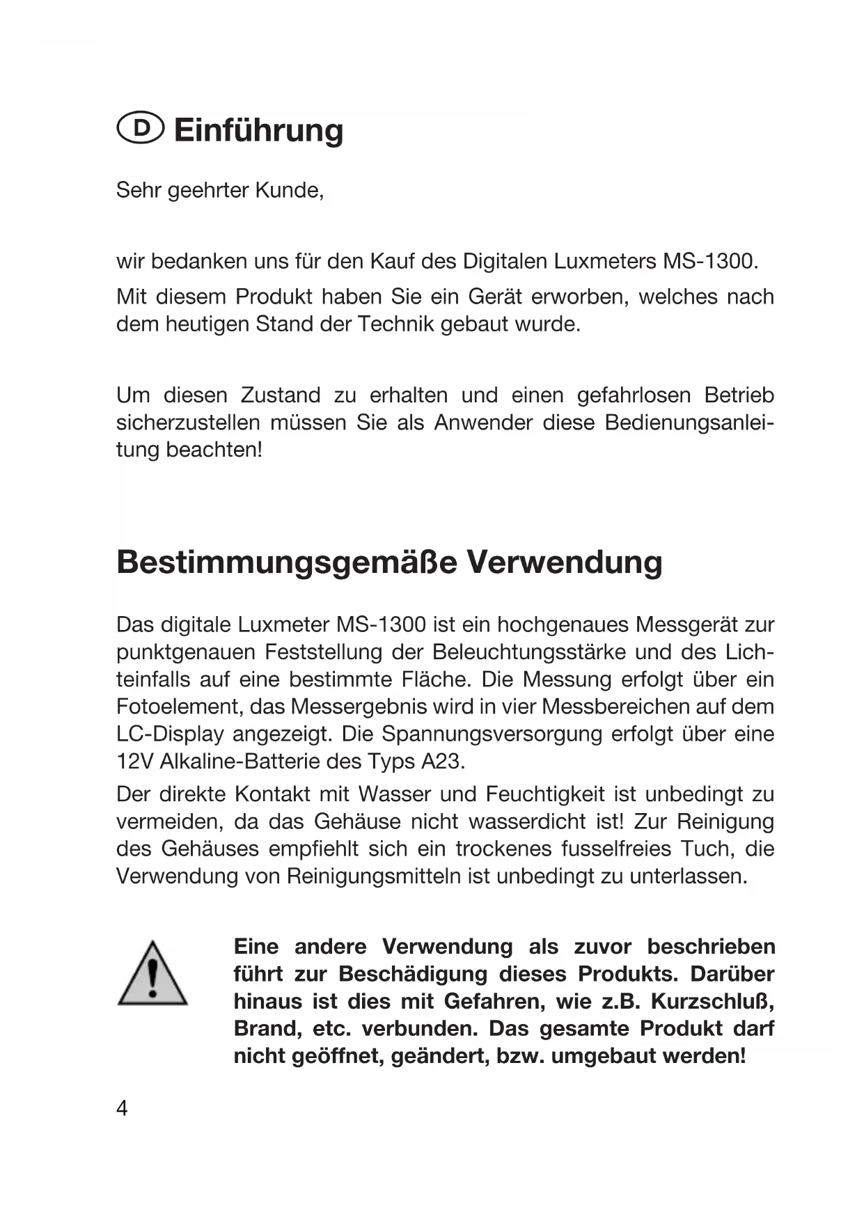 Deze gebruiksaanwijzing hoort bij dit product. Ze bevat belang- rijke wenken m.b.t. ingebruikneming en hantering. Gelieve hiermee rekening te houden, zelfs indien u het product aan derden door- geeft. Gelieve deze gebruiksaanwijzing zorgvuldig te bewaren voor latere raad- pleging!3 Rückseite Back Face arrière Achterzijde Vorderseite Front Face avant Voorzijde Sensor Sensor Détecteur Sensor Einführung Sehr geehrter Kunde, wir bedanken uns für den Kauf des Digitalen Luxmeters MS-1300. Mit diesem Produkt haben Sie ein Gerät erworben, welches nach dem heutigen Stand der Technik gebaut wurde. Um diesen Zustand zu erhalten und einen gefahrlosen Betrieb sicherzustellen müssen Sie als Anwender diese Bedienungsanlei- tung beachten! Bestimmungsgemäße Verwendung Das digitale Luxmeter MS-1300 ist ein hochgenaues Messgerät zur punktgenauen Feststellung der Beleuchtungsstärke und des Lich- teinfalls auf eine bestimmte Fläche. Die Messung erfolgt über ein Fotoelement, das Messergebnis wird in vier Messbereichen auf dem LC-Display angezeigt. Die Spannungsversorgung erfolgt über eine 12V Alkaline-Batterie des Typs A23. Der direkte Kontakt mit Wasser und Feuchtigkeit ist unbedingt zu vermeiden, da das Gehäuse nicht wasserdicht ist! Zur Reinigung des Gehäuses empfiehlt sich ein trockenes fusselfreies Tuch, die Verwendung von Reinigungsmitteln ist unbedingt zu unterlassen. Eine andere Verwendung als zuvor beschrieben führt zur Beschädigung dieses Produkts. Darüber hinaus ist dies mit Gefahren, wie z.B. Kurzschluß, Brand, etc. verbunden. Das gesamte Produkt darf nicht geöffnet, geändert, bzw. umgebaut werden! 4Lieferumfang: Digitales Luxmeter MS-1300 mit fest montiertem Sensor · Trage- und Aufbewahrungstasche · Bedienungsanleitung Sicherheitshinweise Bei Schäden, die durch Nichtbeachten der Anleitung verursacht werden, erlischt der Garantieanspruch! Für Folgeschäden, die daraus resultieren, überneh- men wir keine Haftung! Bei Sach- oder Personenschäden, die durch un- sachgemäße Handhabung oder Nichtbeachtung der Sicherheitshinweise verursacht werden, überneh- men wir keine Haftung. In solchen Fällen erlischt jeder Garantieanspruch. Aus Sicherheits – und Zulassungsgründen (CE) ist das eigenmächti- ge Umbauen und/oder Verändern des Gerätes nicht gestattet. Bei dem Gerät handelt es sich nicht um ein Kinderspielzeug · Halten Sie es von Kindern fern. Setzen Sie das Gerät keinen mechanischen Belastungen aus, ein Kontakt mit Feuchtigkeit und Flüssigkeiten ist unbedingt zu vermei- den. Das Gerät darf nur bei geeigneter Witterung oder mit entspre- chendem Schutz im Freien verwendet werden. Der Lichtsensor oder das Gerät darf durch die Lichtquelle nicht stark erhitz werden. Halten Sie bei Lichtquellen mit starker Hitzeent- wicklung ausreichend Abstand. 5Informationen zur richtigen Beleuchtungsstärke Die Stärke der Beleuchtung wird in Lux gemessen. Die Anpas- sungsfähigkeit des menschlichen Auges ist nahezu unbegrenzt. Das verführt leicht dazu, dem auge auch bei ungenügender Beleuchtung große Sehleistung abzuverlangen. Wenn Licht fehlt oder nicht genü- gend vorhanden ist, kann das Auge seine Sehaufgaben nur unter Anstrengung oder gar nicht erfüllen. Nicht selten sind dann Augen- leiden die Folge · Unfälle häufen sich. Mit dem digitalem Luxmeter MS-1300 haben Sie nun ein Produkt erworben, mit dem sie überall prüfen können, ob für die normalen Sehaufgaben (das sind Aufgaben die Sie täglich erledigen wirklich ausreichende Beleuchtungsstärken vorhanden sind. Sehen ist Erkennen von Helligkeits- und Farbunterschieden, Formen, Bewegungen sowie Entfernungen. Nur bei der richtigen Beleuch- tungsstärke kann das Auge seine aufgaben erfüllen. Deshalb ist gut- es Licht so wichtig. Mit Licht wird oft am falschen Platz gespart. Dunkle Zonen stimmen unfreundlich. Gönnen sie sich mehr Licht. Die Art der Beleuchtung beeinflusst die Information, die das Auge dem Gehirn vermittelt. Lenken Sie zusätzlich mehr Licht dorthin, wo genaues Sehen wichtig ist. In Räumen welche dunkler als 30 Lux sind besteht Unfallgefahr! Ältere Menschen brauchen mehr Licht, da Ihre Sehschärfe nachge- lassen hat. Ein 60-jähriger braucht etwa doppelt soviel Licht wie ein 30-jähriger. Geräte-Beschreibung (Abbildung siehe Ausklappseite)