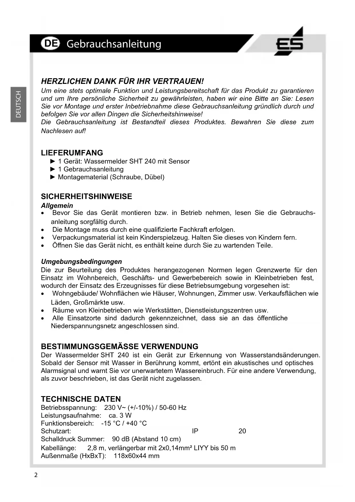 ES2 HERZLICHEN DANK FÜR IHR VERTRAUEN! Um eine stets optimale Funktion und Leistungsbereitschaft für das Produkt zu garantieren und um Ihre persönliche Sicherheit zu gewährleisten, haben wir eine Bitte an Sie: Lesen Sie vor Montage und erster Inbetriebnahme diese Gebrauchsanleitung gründlich durch und befolgen Sie vor allen Dingen die Sicherheitshinweise! Die Gebrauchsanleitung ist Bestandteil dieses Produktes. Bewahren Sie diese zum Nachlesen auf! LIEFERUMFANG ► 1 Gerät: Wassermelder SHT 240 mit Sensor ► 1 Gebrauchsanleitung ► Montagematerial (Schraube, Dübel) SICHERHEITSHINWEISE Allgemein