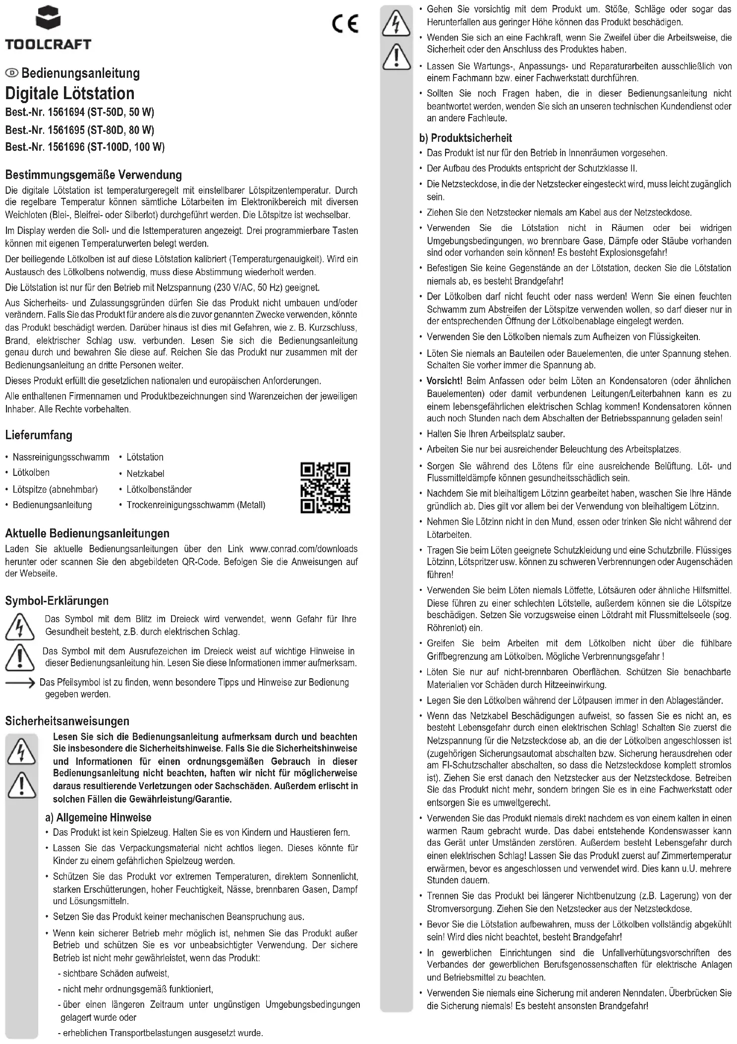 den gleichen Werten (siehe Kapitel „Technische Daten“). Sollte die Sicherung nach der Inbetriebnahme der Lötstation erneut auslösen, so schalten Sie die Lötstation aus und ziehen Sie den Netzstecker aus der Netzsteckdose. Betreiben Sie Lötstation nicht mehr, sondern lassen Sie sie von einem Fachmann überprüfen. Entsorgung Elektronische Geräte sind Wertstoffe und gehören nicht in den Hausmüll. Entsorgen Sie das Produkt am Ende seiner Lebensdauer gemäß den geltenden gesetzlichen Bestimmungen. Sie erfüllen damit die gesetzlichen Verpichtungen und leisten Ihren Beitrag zum Umweltschutz. Technische Daten Lötstation-Typ ST-50D ST-80D ST-100D Best.-Nr. 1561694 1561695 1561696 Betriebsspannung 230 V/AC, 50 Hz Leistungsaufnahme max. 65 W max. 100 W max. 118 W Lötkolbenspannung 24 V/AC Lötkolbenleistung 50 W 80 W 100 W Lötspitzentemperatur 150 °C bis 450 °C (einstellbar) Aufheizdauer (25 °C bis 450 °C) 120 s 80 s 60 s ESD-/ Potentialausgleichsbuchse Buchsendurchmesser (Ø 4 mm) Sicherungstyp 5 x 20 mm Sicherungswert 250 V, 400 mA, träge 250 V, 630 mA, träge 250 V, 630 mA, träge Gewicht der Lötstation 1.750 g 2.030 g 2.350 g Kabellänge des Lötkolbens ca. 100 cm Abmessungen der Lötstation (B x H x T) 122 x 99 x 178 mm Abmessungen des Lötkolbenständers (B x H x T) 71 x 85 x 158 mm• Maintenance, modications and repairs must only be completed by a technician or an authorised repair centre.