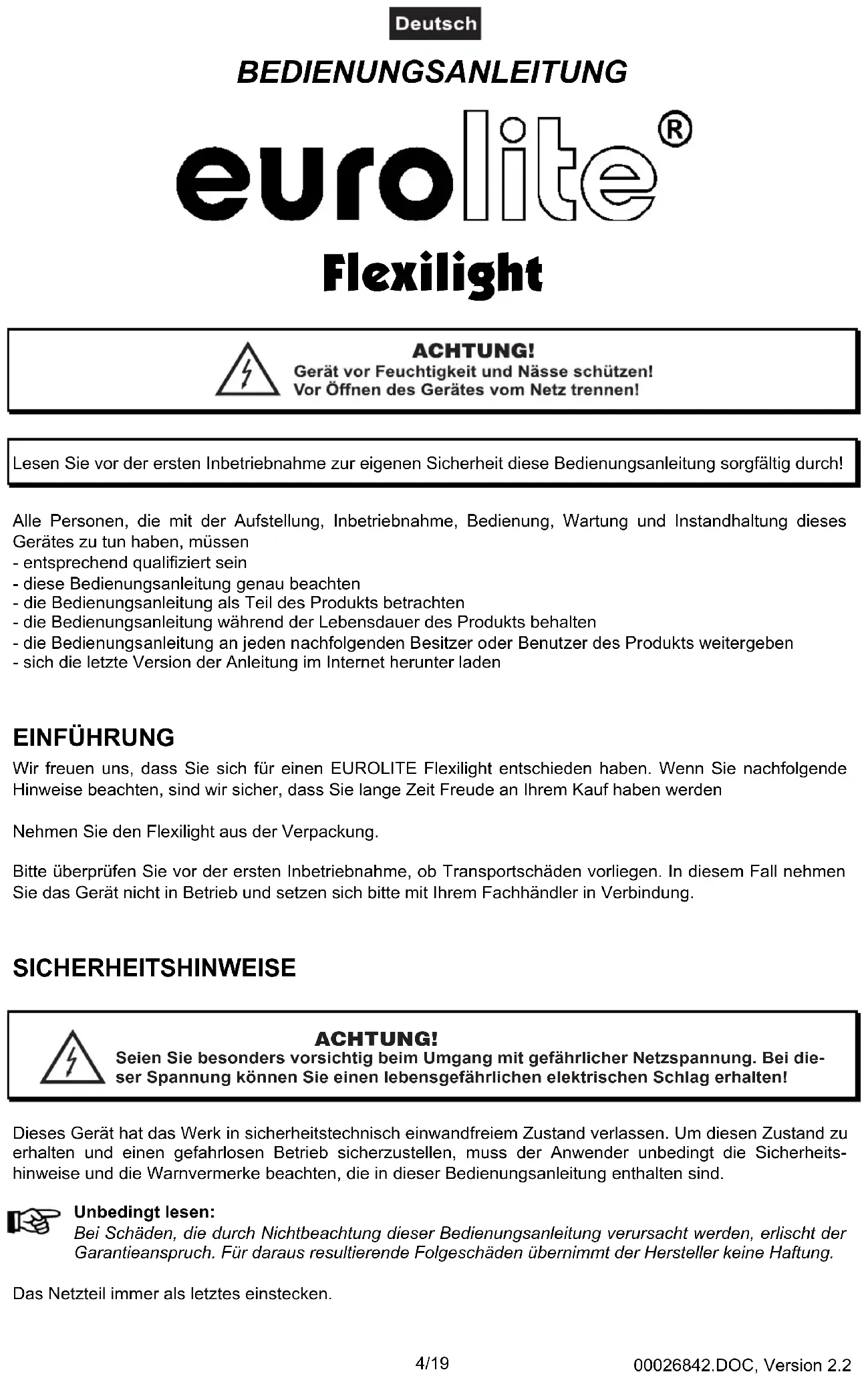 - ESPECIFICACIONES TÉCNICAS 026842.DOC, Version 2.2 3/19 Diese Bedienungsanleitung gilt für die Artikelnummern: 80702305, 8070230I, 80702350, 80702351, 80702353, 80702355, 80702349 This user manual is valid for the article numbers: 80702305, 8070230I, 80702350, 80702351, 80702353, 80702355, 80702349 Ce mode d'emploi est concu pour les n° d'art.: 80702305, 8070230I, 80702350, 80702351, 80702353, 80702355, 80702349 Este manual del usuario es válido para las referencias: 80702305, 8070230I, 80702350, 80702351, 80702353, 80702355, 80702349 Das neueste Update dieser Bedienungsanleitung finden Sie im Internet unter: You can find the latest update of this user manual in the Internet under: Vous pouvez trouvez la dernière version de ce mode d'emploi dans l'Internet sous: Vd. puede encontrar la versión más reciente de este manual en el Internet bajo: www.eurolite.de00026842.DOC, Version 2.2 4/19 BEDIENUNGSANLEITUNG Flexilight Lesen Sie vor der ersten Inbetriebnahme zur eigenen Sicherheit diese Bedienungsanleitung sorgfältig durch!Alle Personen, die mit der Aufstellung, Inbetriebnahme, Bedienung, Wartung und Instandhaltung diesesGerätes zu tun haben, müssen- entsprechend qualifiziert sein- diese Bedienungsanleitung genau beachten- die Bedienungsanleitung als Teil des Produkts betrachten- die Bedienungsanleitung während der Lebensdauer des Produkts behalten - die Bedienungsanleitung an jeden nachfolgenden Besitzer oder Benutzer des Produkts weitergeben - sich die letzte Version der Anleitung im Internet herunter laden EINFÜHRUNG Wir freuen uns, dass Sie sich für einen EUROLITE Flexilight entschieden haben. Wenn Sie nachfolgendeHinweise beachten, sind wir sicher, dass Sie lange Zeit Freude an Ihrem Kauf haben werdenNehmen Sie den Flexilight aus der Verpackung.Bitte überprüfen Sie vor der ersten Inbetriebnahme, ob Transportschäden vorliegen. In diesem Fall nehmenSie das Gerät nicht in Betrieb und setzen sich bitte mit Ihrem Fachhändler in Verbindung. SICHERHEITSHINWEISE ACHTUNG! SeienSiebesondersvorsichtigbeimUmgangmitgefährlicherNetzspannung.Beidie-serSpannungkönnenSieeinenlebensgefährlichenelektrischenSchlagerhalten! Dieses Gerät hat das Werk in sicherheitstechnisch einwandfreiem Zustand verlassen. Um diesen Zustand zu erhalten und einen gefahrlosen Betrieb sicherzustellen, muss der Anwender unbedingt die Sicherheits- hinweise und die Warnvermerke beachten, die in dieser Bedienungsanleitung enthalten sind. Unbedingt lesen: Bei Schäden, die durch Nichtbeachtung dieser Bedienungsanleitung verursacht werden, erlischt der Garantieanspruch. Für daraus resultierende Folgeschäden übernimmt der Hersteller keine Haftung. Das Netzteil immer als letztes einstecken.00026842.DOC, Version 2.2 5/19 Halten Sie das Gerät von Hitzequellen wie Heizkörpern oder Heizlüftern fern. Das Gerät darf nicht in Betrieb genommen werden, nachdem es von einem kalten in einen warmen Raum gebracht wurde. Das dabei entstehende Kondenswasser kann unter Umständen Ihr Gerät zerstören. Lassen Sie das Gerät solange uneingeschaltet, bis es Zimmertemperatur erreicht hat! Der Aufbau des Gerätes entspricht der Schutzklasse III. Das Gerät darf niemals ohne Transformator betrieben werden. (Gilt nur für Artikel 80702305, 8070230I und 80702349) Gerät bei Nichtbenutzung und vor jeder Reinigung vom Netz trennen. Beachten Sie bitte, dass Schäden, die durch manuelle Veränderungen an diesem Gerät verursacht werden, nicht unter den Garantieanspruch fallen. Kinder und Laien vom Gerät fern halten! Im Geräteinneren befinden sich keine zu wartenden Teile. Eventuelle Servicearbeiten sind ausschließlich dem autorisierten Fachhandel vorbehalten! p. 1900