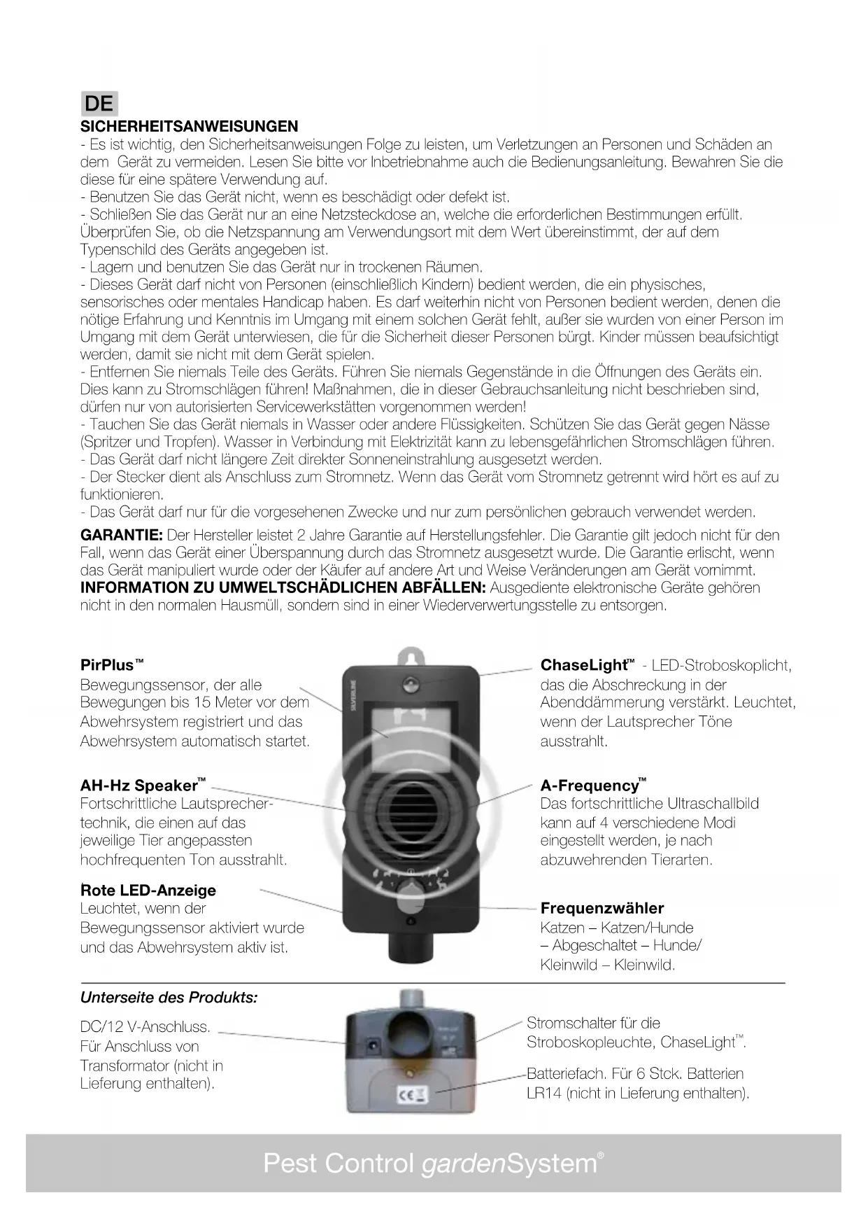 DC/12 V-Anschluss. Für Anschluss von Transformator (nicht in Lieferung enthalten). Unterseite des Produkts: Batteriefach. Für 6 Stck. Batterien LR14 (nicht in Lieferung enthalten).Pest Control gardenSystem