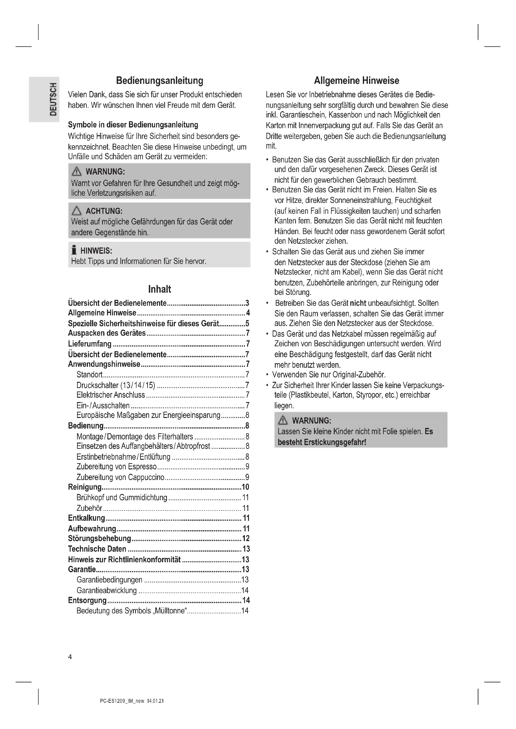 PCES 1209 - Kaffeemaschine PROFICOOK - Kostenlose Bedienungsanleitung