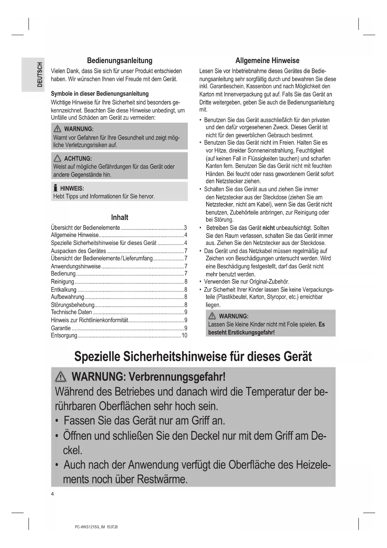 BEDIENUNGSANLEITUNG PCWKS 1215 G PROFICOOK