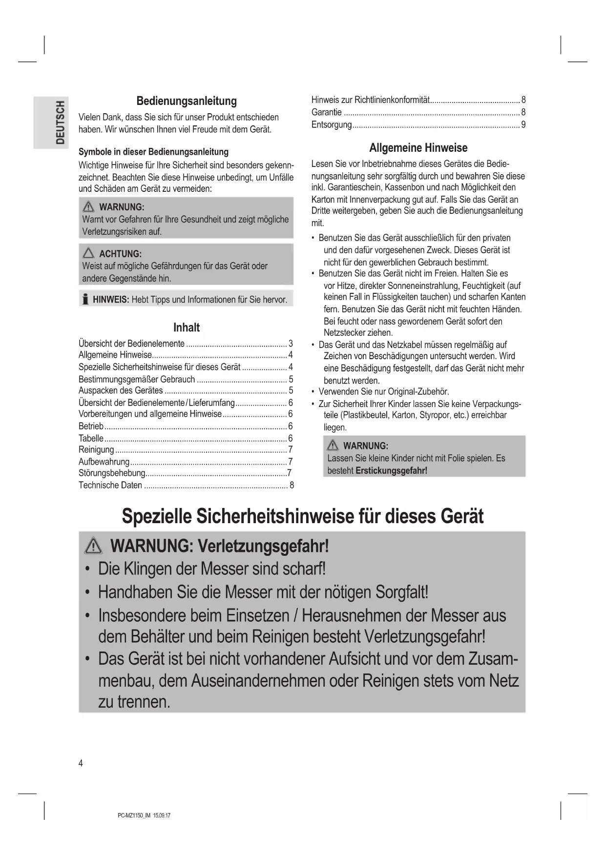 - Das Gerät ist bei nicht vorhandener Aufsicht und vor dem Zusam- menbau, dem Auseinandernehmen oder Reinigen stets vom Netz zu trennen.5 PC-MZ1150_IM 15.09.17 WARNUNG: Verletzungsgefahr!
