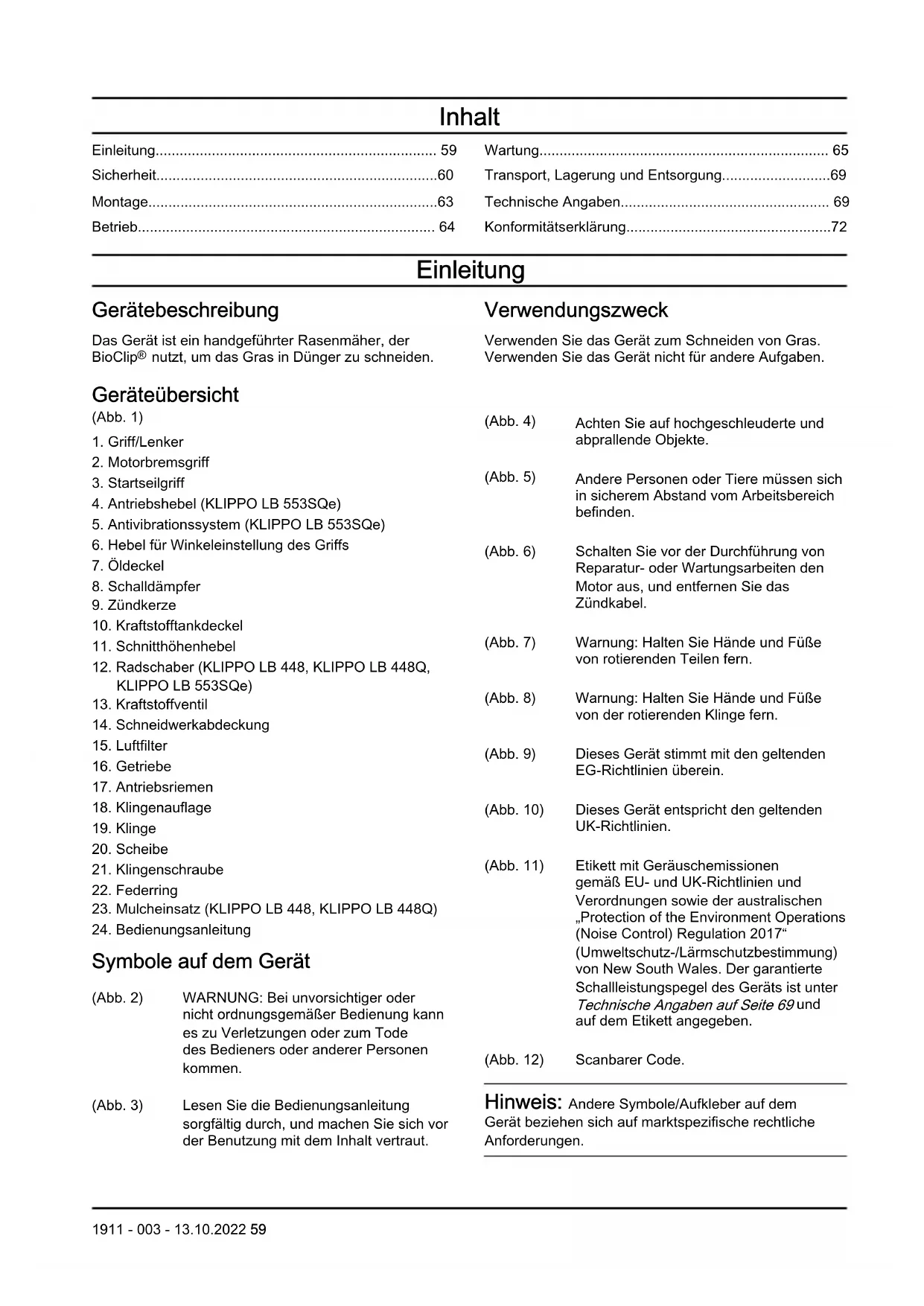 Symbole auf dem Gerät (Abb. 2) WARNUNG: Bei unvorsichtiger oder nicht ordnungsgemäßer Bedienung kann es zu Verletzungen oder zum Tode des Bedieners oder anderer Personen kommen. (Abb. 3) Lesen Sie die Bedienungsanleitung sorgfältig durch, und machen Sie sich vor der Benutzung mit dem Inhalt vertraut. (Abb. 4) Achten Sie auf hochgeschleuderte und abprallende Objekte. (Abb. 5) Andere Personen oder Tiere müssen sich in sicherem Abstand vom Arbeitsbereich befinden. (Abb. 6) Schalten Sie vor der Durchführung von Reparatur- oder Wartungsarbeiten den Motor aus, und entfernen Sie das Zündkabel. (Abb. 7) Warnung: Halten Sie Hände und Füße von rotierenden Teilen fern. (Abb. 8) Warnung: Halten Sie Hände und Füße von der rotierenden Klinge fern. (Abb. 9) Dieses Gerät stimmt mit den geltenden EG-Richtlinien überein. (Abb. 10) Dieses Gerät entspricht den geltenden UK-Richtlinien. (Abb. 11) Etikett mit Geräuschemissionen gemäß EU- und UK-Richtlinien und Verordnungen sowie der australischen „Protection of the Environment Operations (Noise Control) Regulation2017“ (Umweltschutz-/Lärmschutzbestimmung) von New South Wales. Der garantierte Schallleistungspegel des Geräts ist unter Technische Angaben auf Seite 69 und auf dem Etikett angegeben. (Abb. 12) Scanbarer Code. Hinweis: Andere Symbole/Aufkleber auf dem Gerät beziehen sich auf marktspezifische rechtliche Anforderungen. 1911 - 003 - 13.10.2022 59Aufkleber auf dem Gerät, nur für Australien und Neuseeland (Abb. 13) Halten Sie Hände und Füße von der rotierenden Rasenmäherklinge fern. Emissionen nach EuroV WARNUNG: Bei jeglichen Manipulationen des Motors erlischt die EU- Typgenehmigung für dieses Produkt. Produkthaftung Im Sinne der Produkthaftungsgesetze übernehmen wir keine Haftung für Schäden, die unser Gerät verursacht, wenn...