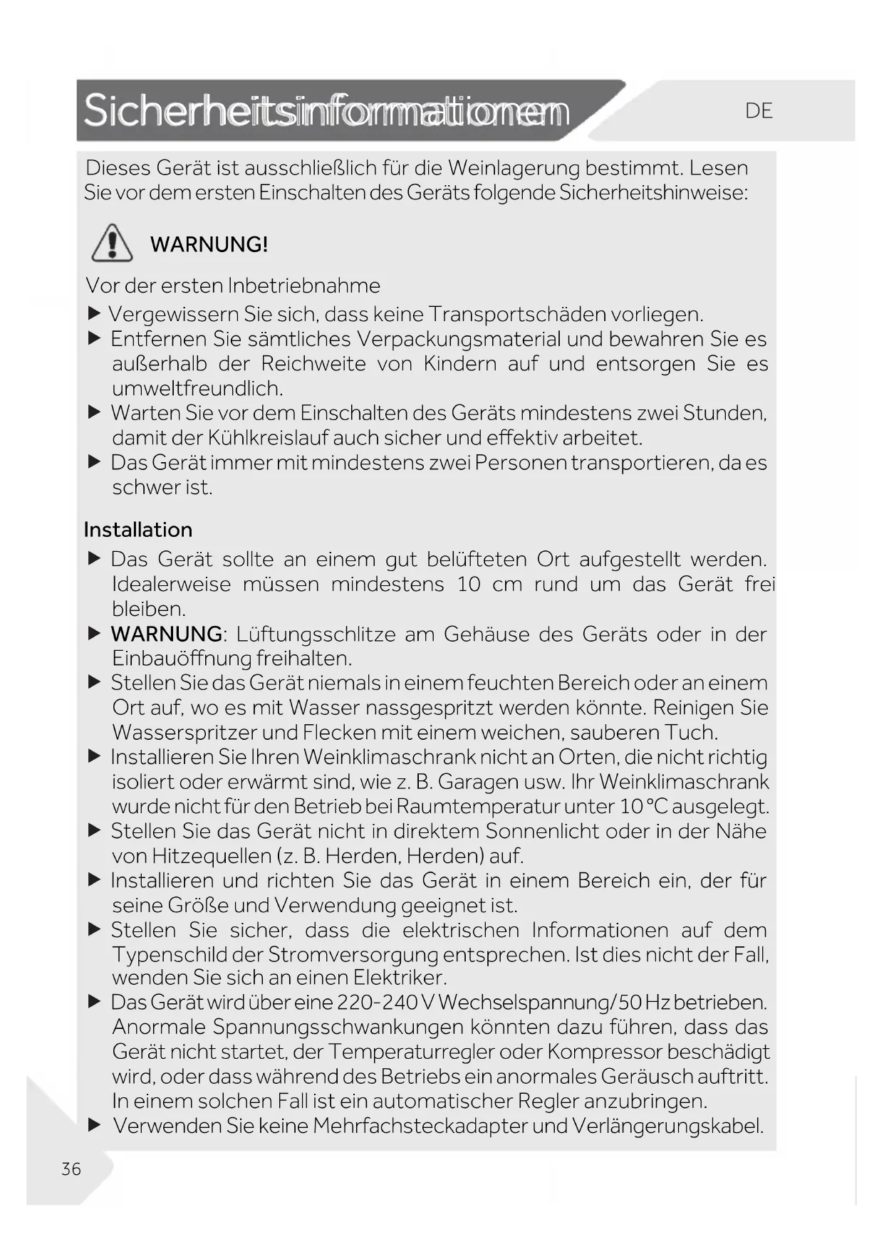 1-Sicherheitsinformationen Dieses Gerät ist ausschließlich für die Weinlagerung bestimmt. Lesen Sie vor dem ersten Einschalten des Geräts folgende Sicherheitshinweise: àÊÛ×Þ×Ð Vor der ersten Inbetriebnahme f Vergewissern Sie sich, dass keine Transportschäden vorliegen. f Entfernen Sie sämtliches Verpackungsmaterial und bewahren Sie es außerhalb der Reichweite von Kindern auf und entsorgen Sie es umweltfreundlich. f Warten Sie vor dem Einschalten des Geräts mindestens zwei Stunden, damit der Kühlkreislauf auch sicher undHNjHktiv arbeitet. f Das Gerät immer mit mindestens zwei Personen transportieren, da es schwer ist. Òñö÷äïïä÷ìòñ f Das Gerät sollte an einem gut belüfteten Ort aufgestellt werden. Idealerweise müssen mindestens 10 cm rund um das Gerät frei bleiben. f àÊÛ×Þ×Ð: Lüftungsschlitze am Gehäuse des Geräts oder in der EiQEDX¸NjQXng freihalten. f Stellen Sie das Gerät niemals in einem feuchten Bereich oder an einem Ort auf, wo es mit Wasser nassgespritzt werden könnte. Reinigen Sie Wasserspritzer und Flecken mit einem weichen, sauberen Tuch. f Installieren Sie Ihren Weinklimaschrank nicht an Orten, die nicht richtig isoliert oder erwärmt sind, wie z. B. Garagen usw. Ihr Weinklimaschrank wurde nicht für den Betrieb bei Raumtemperatur unter 10 °C ausgelegt. f Stellen Sie das Gerät nicht in direktem Sonnenlicht oder in der Nähe von Hitzequellen (z. B. Herden, Herden) auf. f Installieren und richten Sie das Gerät in einem Bereich ein, der für seine Größe und Verwendung geeignet ist. f Stellen Sie sicher, dass die elektrischen Informationen auf dem Typenschild der Stromversorgung entsprechen. Ist dies nicht der Fall, wenden Sie sich an einen Elektriker. f Das Gerät wird über eine 220-240 V Wechselspannung/50 Hz betrieben. Anormale Spannungsschwankungen könnten dazu führen, dass das Gerät nicht startet, der Temperaturregler oder Kompressor beschädigt wird, oder dass während des Betriebs ein anormales Geräusch auftritt. In einem solchen Fall ist ein automatischer Regler anzubringen.