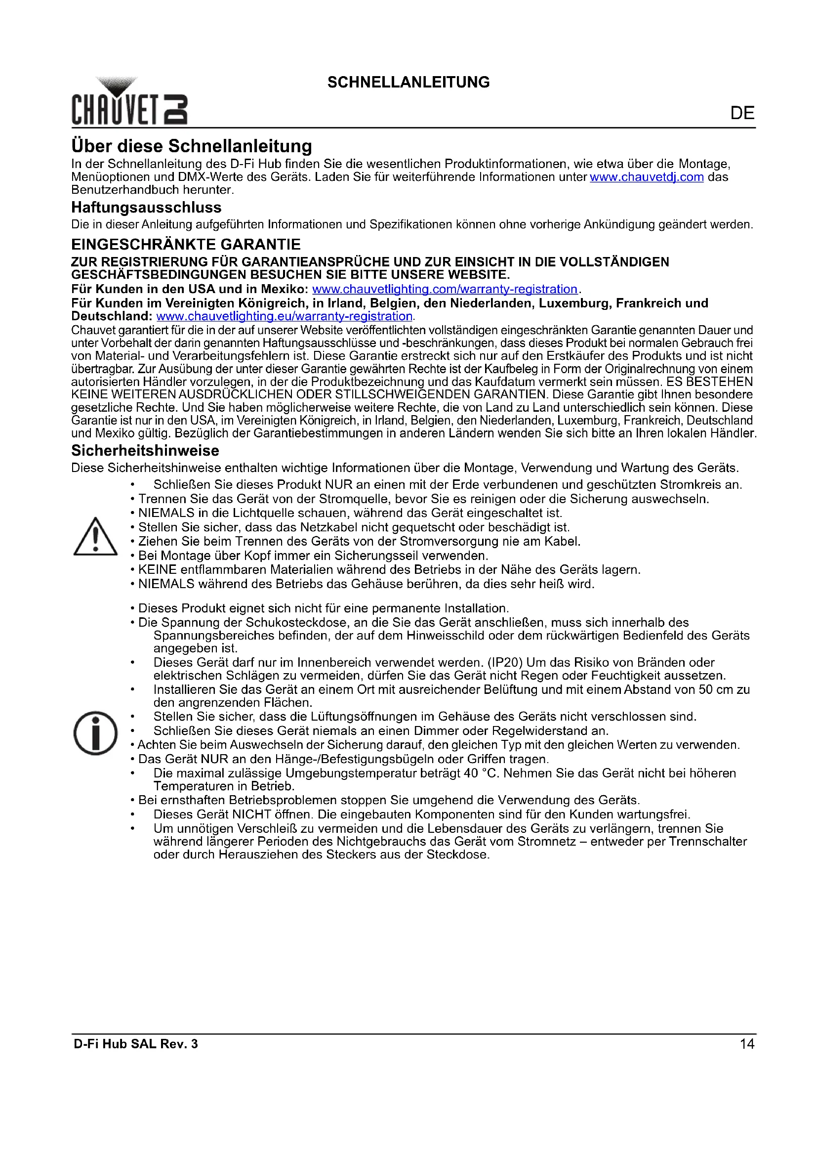 Chauvet garantiert für die in der auf unserer Website veröffentlichten vollständigen eingeschränkten Garantie genannten Dauer und unter Vorbehalt der darin genannten Haftungsausschlüsse und -beschränkungen, dass dieses Produkt bei normalen Gebrauch frei von Material- und Verarbeitungsfehlern ist. Diese Garantie erstreckt sich nur auf den Erstkäufer des Produkts und ist nicht übertragbar. Zur Ausübung der unter dieser Garantie gewährten Rechte ist der Kaufbeleg in Form der Originalrechnung von einem autorisierten Händler vorzulegen, in der die Produktbezeichnung und das Kaufdatum vermerkt sein müssen. ES BESTEHEN KEINE WEITEREN AUSDRÜCKLICHEN ODER STILLSCHWEIGENDEN GARANTIEN. Diese Garantie gibt Ihnen besondere gesetzliche Rechte. Und Sie haben möglicherweise weitere Rechte, die von Land zu Land unterschiedlich sein können. Diese Garantie ist nur in den USA, im Vereinigten Königreich, in Irland, Belgien, den Niederlanden, Luxemburg, Frankreich, Deutschland und Mexiko gültig. Bezüglich der Garantiebestimmungen in anderen Ländern wenden Sie sich bitte an Ihren lokalen Händler. Sicherheitshinweise Diese Sicherheitshinweise enthalten wichtige Informationen über die Montage, Verwendung und Wartung des Geräts.