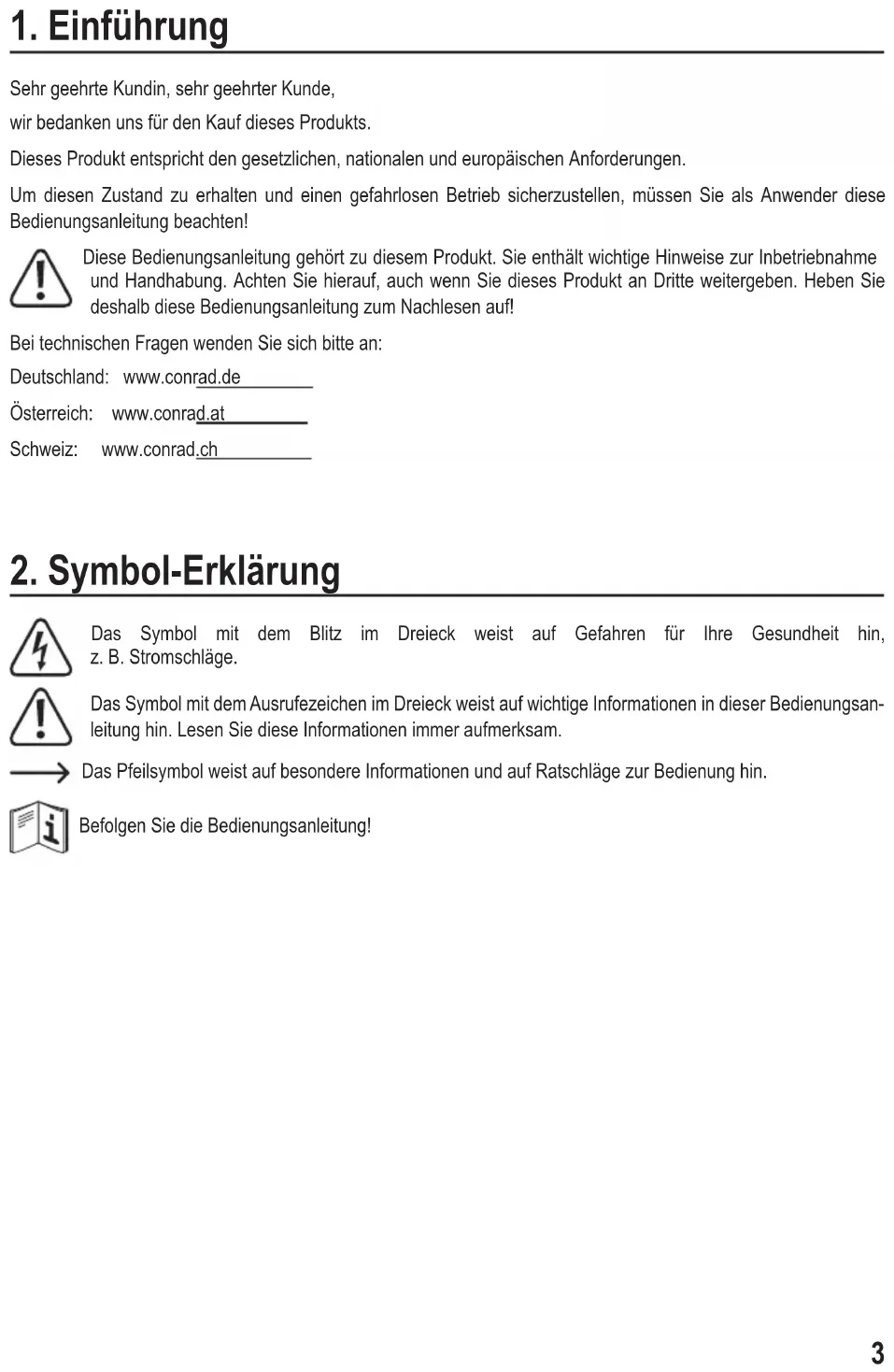 Sehr geehrte Kundin, sehr geehrter Kunde, wir bedanken uns für den Kauf dieses Produkts. Dieses Produkt entspricht den gesetzlichen, nationalen und europäischen Anforderungen. Um diesen Zustand zu erhalten und einen gefahrlosen Betrieb sicherzustellen, müssen Sie als Anwender diese Bedienungsanleitung beachten! Diese Bedienungsanleitung gehört zu diesem Produkt. Sie enthält wichtige Hinweise zur Inbetriebnahme und Handhabung. Achten Sie hierauf, auch wenn Sie dieses Produkt an Dritte weitergeben. Heben Sie deshalb diese Bedienungsanleitung zum Nachlesen auf! Bei technischen Fragen wenden Sie sich bitte an: Deutschland: www.conrad.de Österreich: www.conrad.at Schweiz: www.conrad.ch