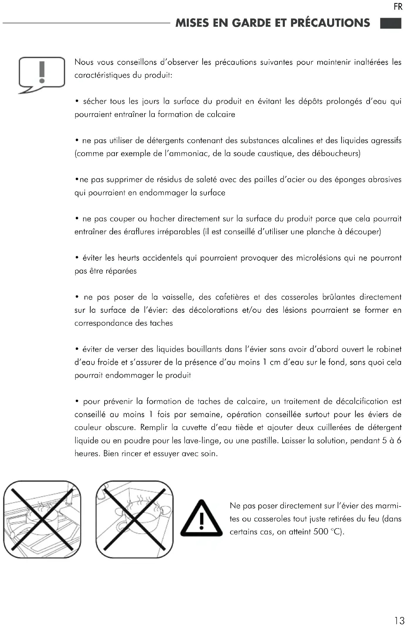 - stellen Sie Geschirr, Kaffeekannen und heiße Töpfe nicht direkt auf die Oberfläche der Spüle: es könnten sich an diesen Stellen Flecken durch Verfärbungen und/oder Beschädigungen bilden