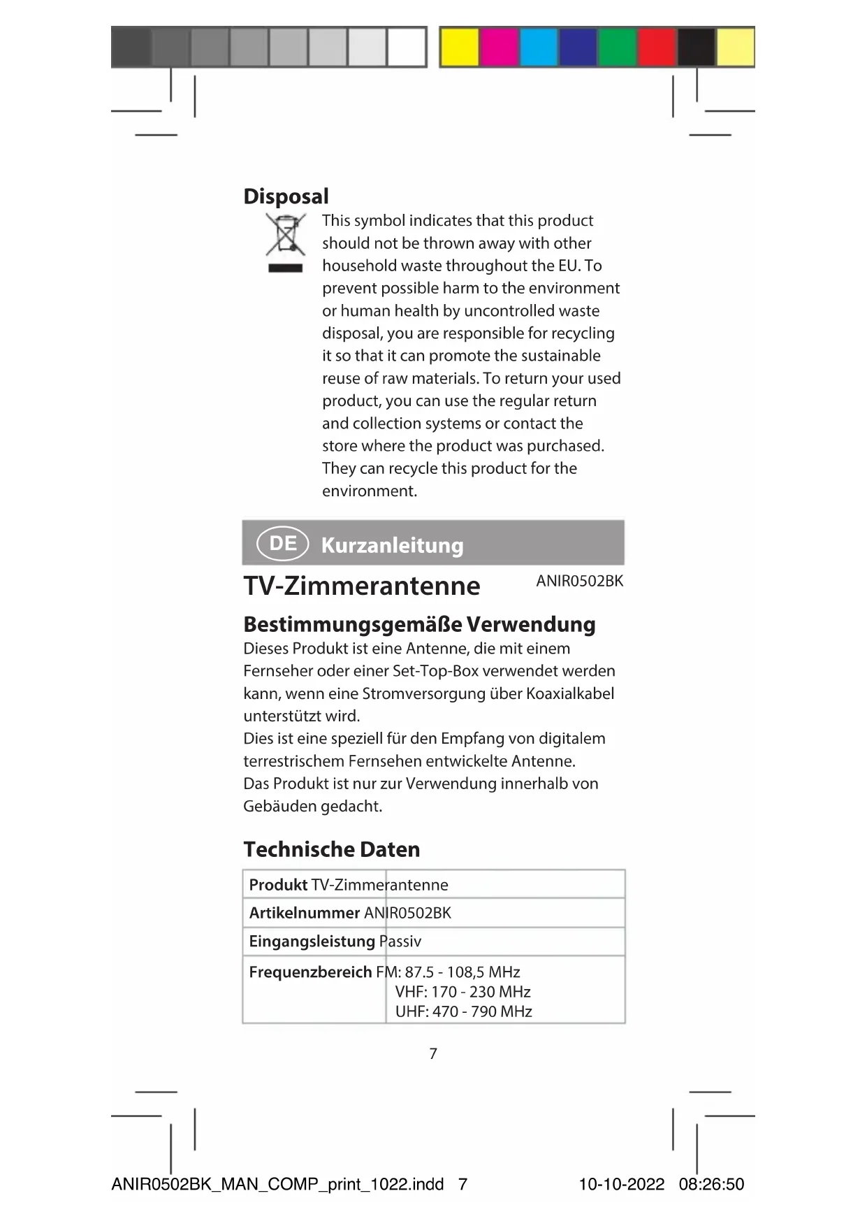 Wenn die Installation abgeschlossen ist, können Sie mit Ihrer Set-Top-Box die Signalstärke und -qualität prüfen. Falls Sie kein stabiles Bild erhalten, bringen Sie die Antenne bitte in eine bessere Empfangsposition. Wenn Sie die beste Position gefunden haben, xieren Sie sie bitte. ANIR0502BK_MAN_COMP_print_1022.indd 10ANIR0502BK_MAN_COMP_print_1022.indd 10 10-10-2022 08:26:5010-10-2022 08:26:5011 Entsorgung Dieses Symbol zeigt an, dass dieses Produkt innerhalb der EU nicht über den normalen Haushaltsabfall entsorgt werden darf. Um mögliche Schäden für die Umwelt oder die Gesundheit durch unkontrollierte Abfallentsorgung zu verhindern, sind Sie dafür verantwortlich, das Produkt so zu recyceln, dass eine nachhaltige Wiederverwendung der Rohstoe möglich ist. Zur Rückgabe des gebrauchten Produktes wenden Sie sich an ihre normale Abfallsammelstelle oder nehmen Sie Kontakt mit dem Händler auf, bei dem das Produkt erworben wurde. Dieser kann das Produkt umweltgerecht recyceln.