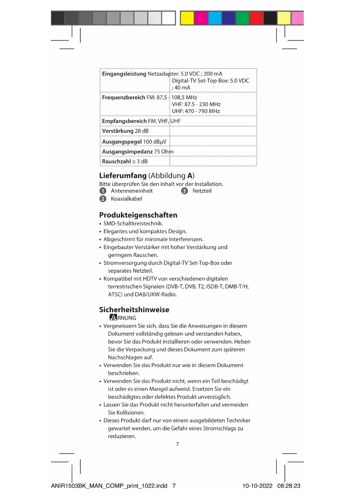 Kurzanleitung TV-Zimmerantenne ANIR1503BK Bestimmungsgemäße Verwendung Dieses Produkt ist eine Antenne, die mit einem Fernseher oder einer Set-Top-Box verwendet werden kann, wenn eine Stromversorgung über Koaxialkabel unterstützt wird. Dies ist eine speziell für den Empfang von digitalem terrestrischem Fernsehen entwickelte Antenne. Das Produkt ist nur zur Verwendung innerhalb von Gebäuden gedacht. Technische Daten Produkt TV-Zimmerantenne Artikelnummer ANIR1503BK ANIR1503BK_MAN_COMP_print_1022.indd 6ANIR1503BK_MAN_COMP_print_1022.indd 6 10-10-2022 08:28:2310-10-2022 08:28:237 Eingangsleistung Netzadapter: 5.0 VDC ; 200 mA Digital-TV Set-Top-Box: 5.0 VDC ; 40 mA Frequenzbereich FM: 87,5 - 108,5 MHz VHF: 87.5 - 230 MHz UHF: 470 - 790 MHz Empfangsbereich FM, VHF, UHF Verstärkung 28 dB Ausgangspegel 100 dBµV Ausgangsimpedanz 75 Ohm Rauschzahl ≤ 3 dB Lieferumfang (Abbildung A) Bitte überprüfen Sie den Inhalt vor der Installation. 1 Antenneneinheit 2 Koaxialkabel 3 Netzteil Produkteigenschaften