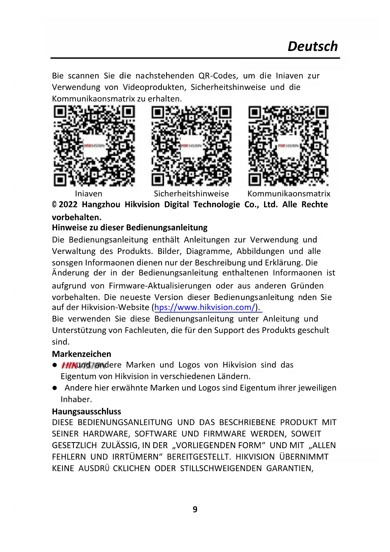 Initiativen Sicherheitshinweise Kommunikationsmatrix © 2022 Hangzhou Hikvision Digital Technologie Co., Ltd. Alle Rechte vorbehalten. Hinweise zu dieser Bedienungsanleitung Die Bedienungsanleitung enthält Anleitungen zur Verwendung und Verwaltung des Produkts. Bilder, Diagramme, Abbildungen und alle sonstigen Informationen dienen nur der Beschreibung und Erklärung. Die Änderung der in der Bedienungsanleitung enthaltenen Informationen ist aufgrund von Firmware-Aktualisierungen oder aus anderen Gründen vorbehalten. Die neueste Version dieser Bedienungsanleitung finden Sie auf der Hikvision-Website (https://www.hikvision.com/). Bitte verwenden Sie diese Bedienungsanleitung unter Anleitung und Unterstützung von Fachleuten, die für den Support des Produkts geschult sind. Markenzeichen und andere Marken und Logos von Hikvision sind das Eigentum von Hikvision in verschiedenen Ländern. Andere hier erwähnte Marken und Logos sind Eigentum ihrer jeweiligen Inhaber. Haftungsausschluss DIESE BEDIENUNGSANLEITUNG UND DAS BESCHRIEBENE PRODUKT MIT SEINER HARDWARE, SOFTWARE UND FIRMWARE WERDEN, SOWEIT GESETZLICH ZULÄSSIG, IN DER „VORLIEGENDEN FORM“ UND MIT „ALLEN FEHLERN UND IRRTÜMERN“ BEREITGESTELLT. HIKVISION ÜBERNIMMT KEINE AUSDRÜ CKLICHEN ODER STILLSCHWEIGENDEN GARANTIEN,Deutsch