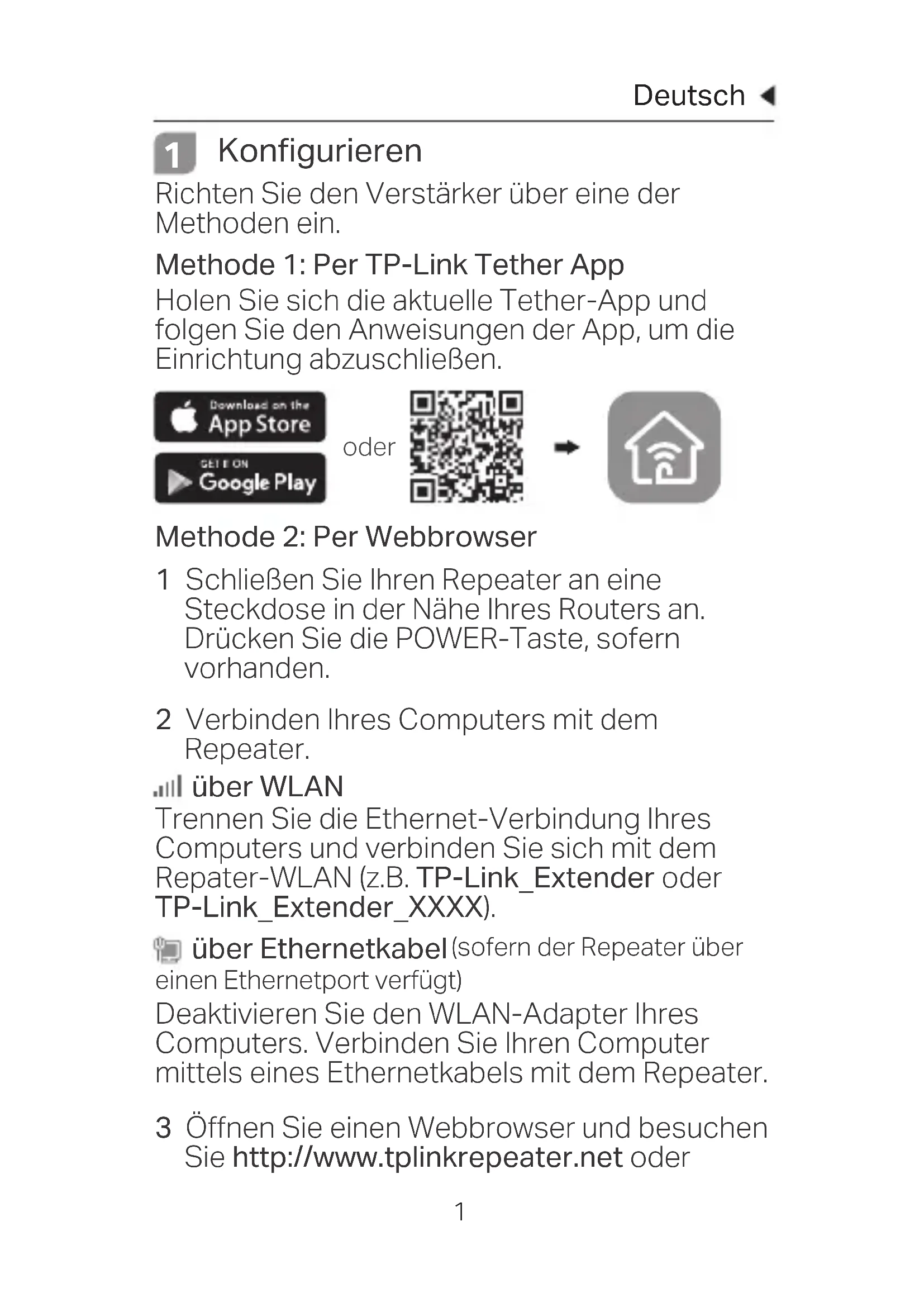 Konfigurieren Richten Sie den Verstärker über eine der Methoden ein. Methode 1: Per TP-Link Tether App Holen Sie sich die aktuelle Tether-App und folgen Sie den Anweisungen der App, um die Einrichtung abzuschließen. Methode 2: Per Webbrowser 1 Schließen Sie Ihren Repeater an eine Steckdose in der Nähe Ihres Routers an. Drücken Sie die POWER-Taste, sofern vorhanden. 2 Verbinden Ihres Computers mit dem Repeater. über WLAN Trennen Sie die Ethernet-Verbindung Ihres Computers und verbinden Sie sich mit dem Repater-WLAN (z.B. TP-Link_Extender oder TP-Link_Extender_XXXX). über Ethernetkabel (sofern der Repeater über einen Ethernetport verfügt) Deaktivieren Sie den WLAN-Adapter Ihres Computers. Verbinden Sie Ihren Computer mittels eines Ethernetkabels mit dem Repeater. 3 Öffnen Sie einen Webbrowser und besuchen Sie http://www.tplinkrepeater.net oder oderDeutsch