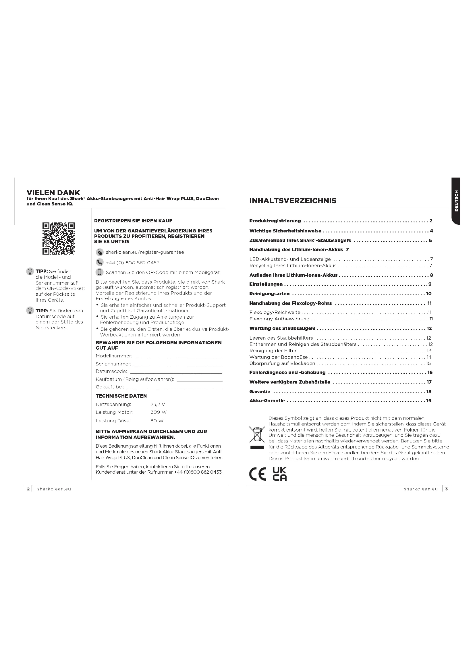 SIE ES UNTER: sharkclean.eu/register-guarantee +44 (0) 800 862 0453 Scannen Sie den QR-Code mit einem Mobilgerät VIELEN DANK für Ihren Kauf des Shark® Akku-Staubsaugers mit Anti-Hair Wrap PLUS, DuoClean und Clean Sense IQ.