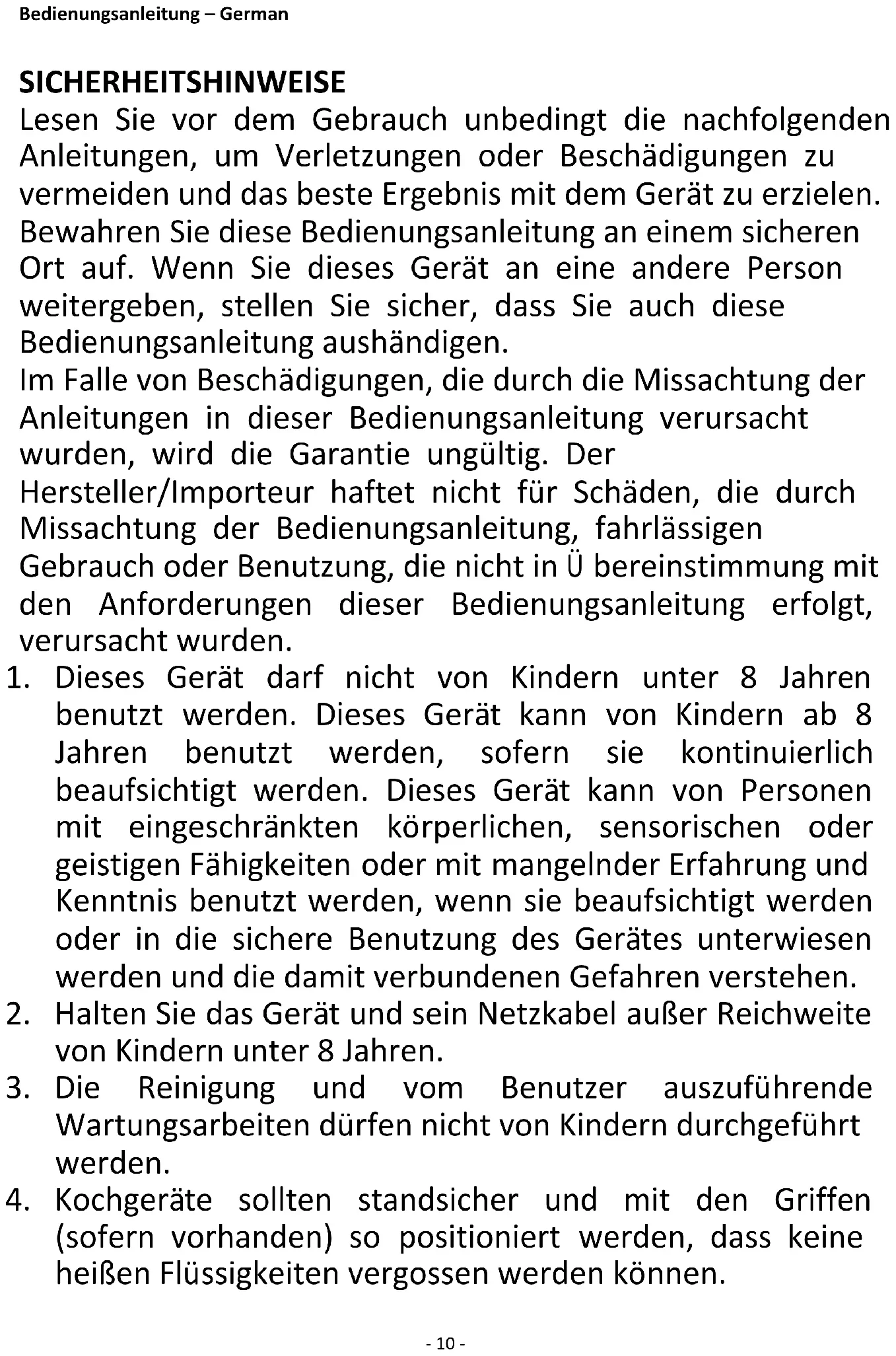 1. Dieses Gerät darf nicht von Kindern unter 8 Jahren