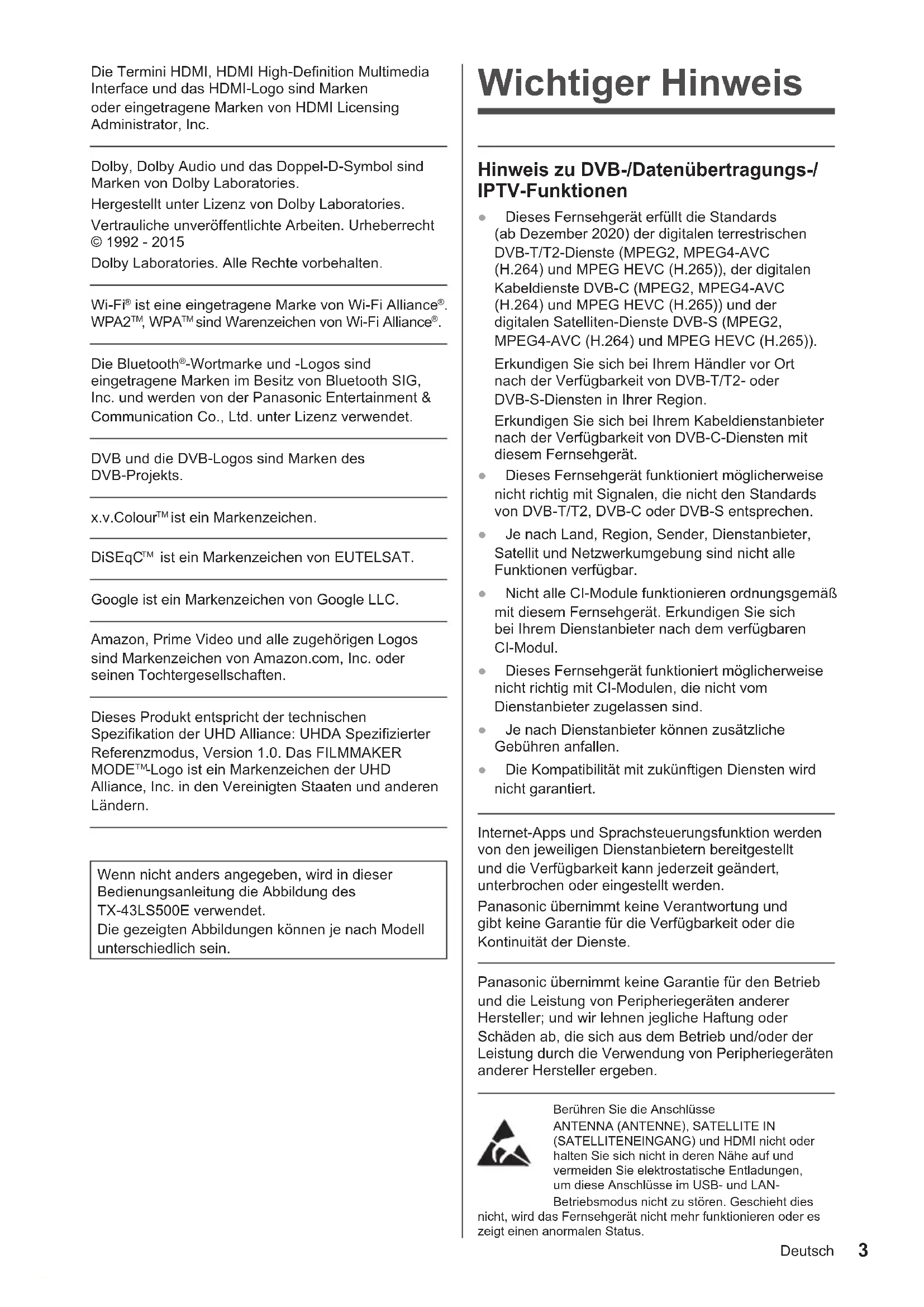 -Logo ist ein Markenzeichen der UHD Alliance, Inc. in den Vereinigten Staaten und anderen Ländern. Wenn nicht anders angegeben, wird in dieser Bedienungsanleitung die Abbildung des TX-43LS500E verwendet. Die gezeigten Abbildungen können je nach Modell unterschiedlich sein. Wichtiger Hinweis Hinweis zu DVB-/Datenübertragungs-/ IPTV-Funktionen ● Dieses Fernsehgerät erfüllt die Standards (ab Dezember 2020) der digitalen terrestrischen DVB-T/T2-Dienste (MPEG2, MPEG4-AVC (H.264) und MPEG HEVC (H.265)), der digitalen Kabeldienste DVB-C (MPEG2, MPEG4-AVC (H.264) und MPEG HEVC (H.265)) und der digitalen Satelliten-Dienste DVB-S (MPEG2, MPEG4-AVC (H.264) und MPEG HEVC (H.265)). Erkundigen Sie sich bei Ihrem Händler vor Ort nach der Verfügbarkeit von DVB-T/T2- oder DVB-S-Diensten in Ihrer Region. Erkundigen Sie sich bei Ihrem Kabeldienstanbieter nach der Verfügbarkeit von DVB-C-Diensten mit diesem Fernsehgerät. ● Dieses Fernsehgerät funktioniert möglicherweise nicht richtig mit Signalen, die nicht den Standards von DVB-T/T2, DVB-C oder DVB-S entsprechen. ● Je nach Land, Region, Sender, Dienstanbieter, Satellit und Netzwerkumgebung sind nicht alle Funktionen verfügbar. ● Nicht alle CI-Module funktionieren ordnungsgemäß mit diesem Fernsehgerät. Erkundigen Sie sich bei Ihrem Dienstanbieter nach dem verfügbaren CI-Modul. ● Dieses Fernsehgerät funktioniert möglicherweise nicht richtig mit CI-Modulen, die nicht vom Dienstanbieter zugelassen sind. ● Je nach Dienstanbieter können zusätzliche Gebühren anfallen. ● Die Kompatibilität mit zukünftigen Diensten wird nicht garantiert. Internet-Apps und Sprachsteuerungsfunktion werden von den jeweiligen Dienstanbietern bereitgestellt und die Verfügbarkeit kann jederzeit geändert, unterbrochen oder eingestellt werden. Panasonic übernimmt keine Verantwortung und gibt keine Garantie für die Verfügbarkeit oder die Kontinuität der Dienste. Panasonic übernimmt keine Garantie für den Betrieb und die Leistung von Peripheriegeräten anderer Hersteller; und wir lehnen jegliche Haftung oder Schäden ab, die sich aus dem Betrieb und/oder der Leistung durch die Verwendung von Peripheriegeräten anderer Hersteller ergeben. Berühren Sie die Anschlüsse