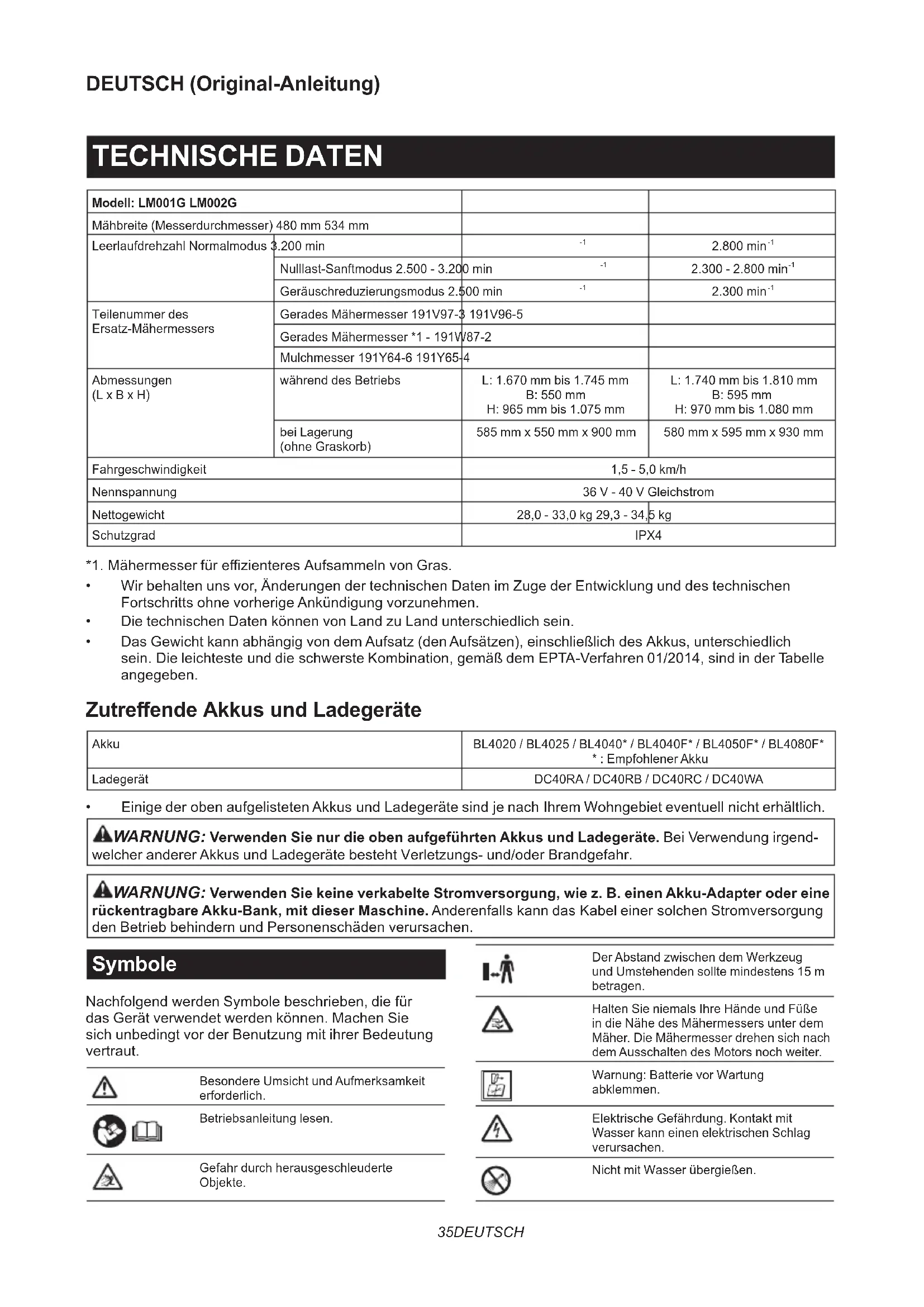 - Einige der oben aufgelisteten Akkus und Ladegeräte sind je nach Ihrem Wohngebiet eventuell nicht erhältlich. WARNUNG: Verwenden Sie nur die oben aufgeführten Akkus und Ladegeräte. Bei Verwendung irgend- welcher anderer Akkus und Ladegeräte besteht Verletzungs- und/oder Brandgefahr. WARNUNG: Verwenden Sie keine verkabelte Stromversorgung, wie z. B. einen Akku-Adapter oder eine rückentragbare Akku-Bank, mit dieser Maschine. Anderenfalls kann das Kabel einer solchen Stromversorgung den Betrieb behindern und Personenschäden verursachen. Symbole Nachfolgend werden Symbole beschrieben, die für das Gerät verwendet werden können. Machen Sie sich unbedingt vor der Benutzung mit ihrer Bedeutung vertraut. Besondere Umsicht und Aufmerksamkeit erforderlich. Betriebsanleitung lesen. Gefahr durch herausgeschleuderte Objekte. Der Abstand zwischen dem Werkzeug und Umstehenden sollte mindestens 15 m betragen. Halten Sie niemals Ihre Hände und Füße in die Nähe des Mähermessers unter dem Mäher. Die Mähermesser drehen sich nach dem Ausschalten des Motors noch weiter. Warnung: Batterie vor Wartung abklemmen. Elektrische Gefährdung. Kontakt mit Wasser kann einen elektrischen Schlag verursachen. Nicht mit Wasser übergießen.36 DEUTSCH Ni-MH Li-ionNur für EU-LänderAufgrund des Vorhandenseins gefährlicher Komponenten in der Ausrüstung können Elektro- und Elektronik-Altgeräte, Akkumulatoren und Batterien sich negativ auf die Umwelt und die menschliche Gesundheit auswirken.Entsorgen Sie Elektro- und Elektronikgeräte oder Batterien nicht mit dem Hausmüll!In Übereinstimmung mit der Europäischen Richtlinie über Elektro- und Elektronik-Altgeräte, Akkumulatoren und Batterien, verbrauchte Akkumulatoren und Batterien sowie ihrer Anpassung an nationales Recht sollten Elektro-Altgeräte, Batterien und Akkumulatoren gemäß den Umweltschutzbestimmungen getrennt gelagert und zu einer getrennten Sammelstelle für Siedlungsabfälle geliefert werden.Dies wird durch das am Gerät angebrachte Symbol der durchgestrichenen Abfalltonne auf Rädern angezeigt.Garantierter Schallleistungspegel gemäß der EU-Richtlinie über Außenlärm.Schallleistungspegel gemäß der australi-schen NSW-Lärmschutzverordnung Vorgesehene Verwendung Die Maschine ist für Rasenmähen vorgesehen. Geräusch Typischer A-bewerteter Geräuschpegel ermittelt gemäß EN62841-4-3: Modell LM001G Gemessener Schallleistungspegel (L
