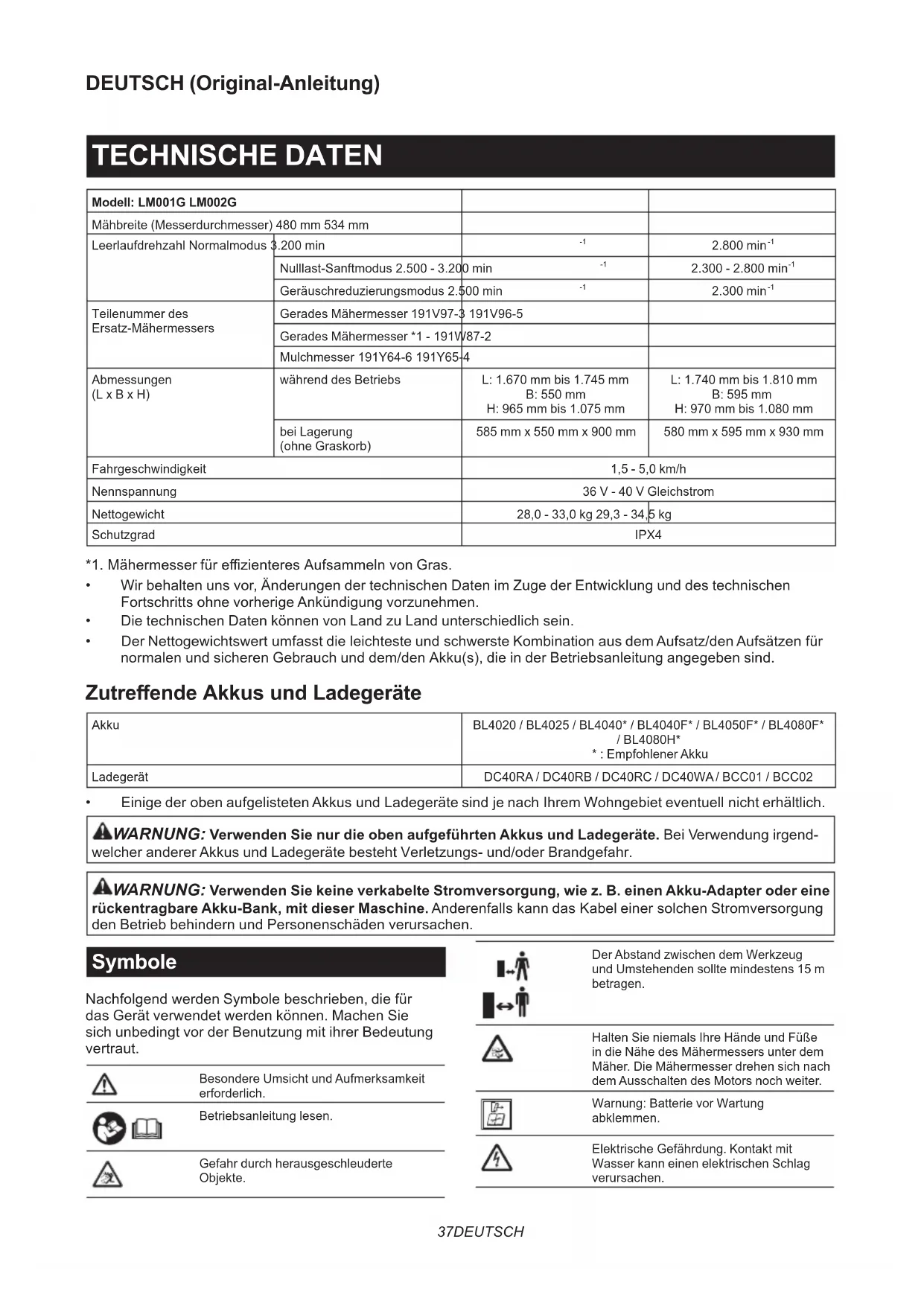 - Einige der oben aufgelisteten Akkus und Ladegeräte sind je nach Ihrem Wohngebiet eventuell nicht erhältlich. WARNUNG: Verwenden Sie nur die oben aufgeführten Akkus und Ladegeräte. Bei Verwendung irgend- welcher anderer Akkus und Ladegeräte besteht Verletzungs- und/oder Brandgefahr. WARNUNG: Verwenden Sie keine verkabelte Stromversorgung, wie z. B. einen Akku-Adapter oder eine rückentragbare Akku-Bank, mit dieser Maschine. Anderenfalls kann das Kabel einer solchen Stromversorgung den Betrieb behindern und Personenschäden verursachen. Symbole Nachfolgend werden Symbole beschrieben, die für das Gerät verwendet werden können. Machen Sie sich unbedingt vor der Benutzung mit ihrer Bedeutung vertraut. Besondere Umsicht und Aufmerksamkeit erforderlich. Betriebsanleitung lesen. Gefahr durch herausgeschleuderte Objekte. Der Abstand zwischen dem Werkzeug und Umstehenden sollte mindestens 15 m betragen. Halten Sie niemals Ihre Hände und Füße in die Nähe des Mähermessers unter dem Mäher. Die Mähermesser drehen sich nach dem Ausschalten des Motors noch weiter. Warnung: Batterie vor Wartung abklemmen. Elektrische Gefährdung. Kontakt mit Wasser kann einen elektrischen Schlag verursachen.38 DEUTSCH Nicht mit Wasser übergießen. Ni-MH Li-ion Nur für EU-Länder Aufgrund des Vorhandenseins gefähr- licher Komponenten in der Ausrüstung können Elektro- und Elektronik-Altgeräte, Akkumulatoren und Batterien sich nega- tiv auf die Umwelt und die menschliche Gesundheit auswirken. Entsorgen Sie Elektro- und Elektronikgeräte oder Batterien nicht mit dem Hausmüll! In Übereinstimmung mit der Europäischen Richtlinie über Elektro- und Elektronik- Altgeräte, Akkumulatoren und Batterien, verbrauchte Akkumulatoren und Batterien sowie ihrer Anpassung an nati- onales Recht sollten Elektro-Altgeräte, Batterien und Akkumulatoren gemäß den Umweltschutzbestimmungen getrennt gelagert und zu einer getrennten Sammelstelle für Siedlungsabfälle geliefert werden. Dies wird durch das am Gerät angebrachte Symbol der durchgestrichenen Abfalltonne auf Rädern angezeigt. Garantierter Schallleistungspegel gemäß der EU-Richtlinie über Außenlärm. Schallleistungspegel gemäß der australi- schen NSW-Lärmschutzverordnung Vorgesehene Verwendung Die Maschine ist für Rasenmähen vorgesehen. Geräusch Typischer A-bewerteter Geräuschpegel ermittelt gemäß EN62841-4-3: Modell LM001G Gemessener Schallleistungspegel (L