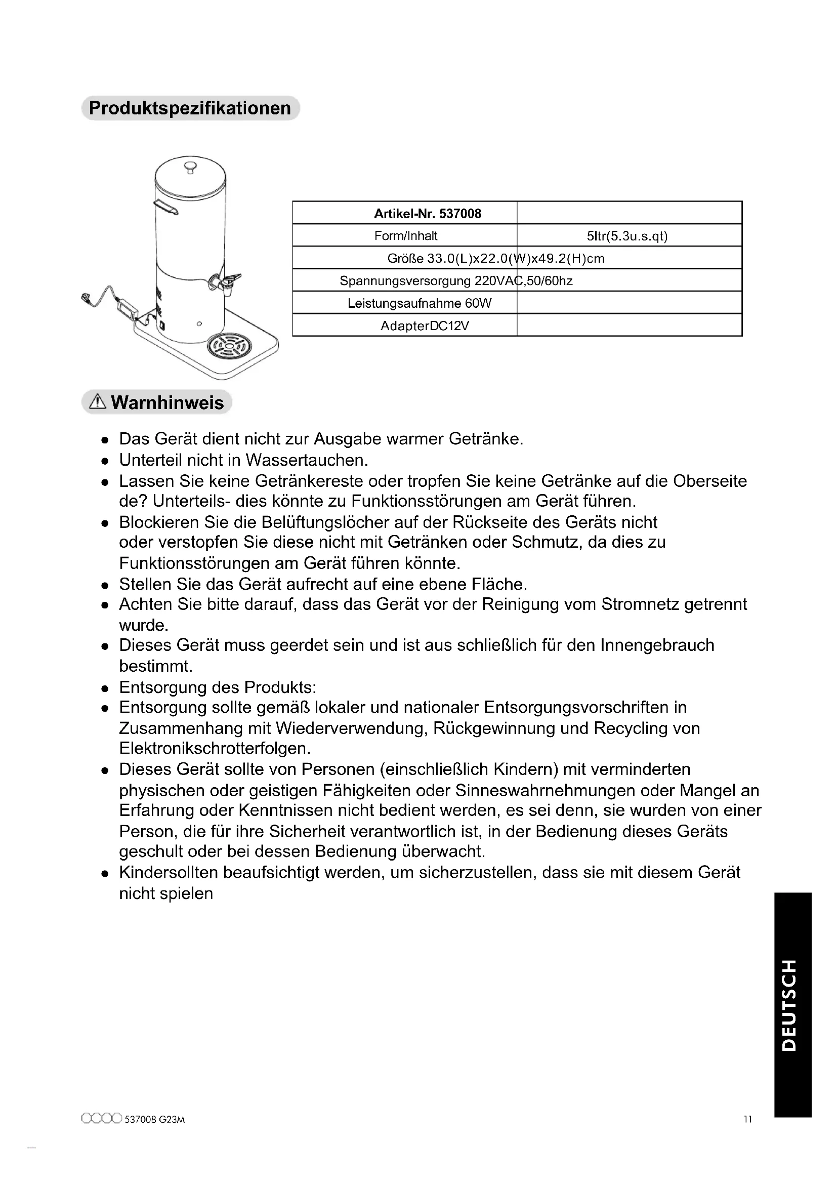 détergent deux. Pièces détachées Image Description No. De la pièce Récipient PB2370 Couvercle 030510L Robinet P2285 Passoire B2358M Cuvette d’égouttage B2359M537008 G23M 11 DEUTSCH Produktspezikationen Artikel-Nr. 537008 Form/Inhalt 5ltr(5.3u.s.qt) Größe 33.0(L)x22.0(W)x49.2(H)cm Spannungsversorgung 220VAC,50/60hz Leistungsaufnahme 60W Adapter DC12V Warnhinweis
