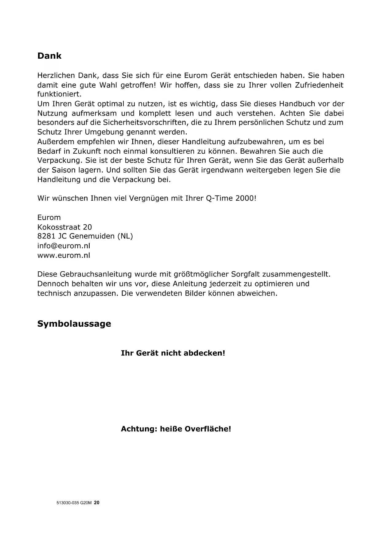 513030-035 G20M 20 Dank Herzlichen Dank, dass Sie sich für eine Eurom Gerät entschieden haben. Sie haben damit eine gute Wahl getroffen! Wir hoffen, dass sie zu Ihrer vollen Zufriedenheit funktioniert. Um Ihren Gerät optimal zu nutzen, ist es wichtig, dass Sie dieses Handbuch vor der Nutzung aufmerksam und komplett lesen und auch verstehen. Achten Sie dabei besonders auf die Sicherheitsvorschriften, die zu Ihrem persönlichen Schutz und zum Schutz Ihrer Umgebung genannt werden. Außerdem empfehlen wir Ihnen, dieser Handleitung aufzubewahren, um es bei Bedarf in Zukunft noch einmal konsultieren zu können. Bewahren Sie auch die Verpackung. Sie ist der beste Schutz für Ihren Gerät, wenn Sie das Gerät außerhalb der Saison lagern. Und sollten Sie das Gerät irgendwann weitergeben legen Sie die Handleitung und die Verpackung bei. Wir wünschen Ihnen viel Vergnügen mit Ihrer Q-Time 2000! Eurom Kokosstraat 20 8281 JC Genemuiden (NL) info@eurom.nl www.eurom.nl Diese Gebrauchsanleitung wurde mit größtmöglicher Sorgfalt zusammengestellt. Dennoch behalten wir uns vor, diese Anleitung jederzeit zu optimieren und technisch anzupassen. Die verwendeten Bilder können abweichen. Symbolaussage Ihr Gerät nicht abdecken! Achtung: heiße Overfläche!513030-035 G20M 21