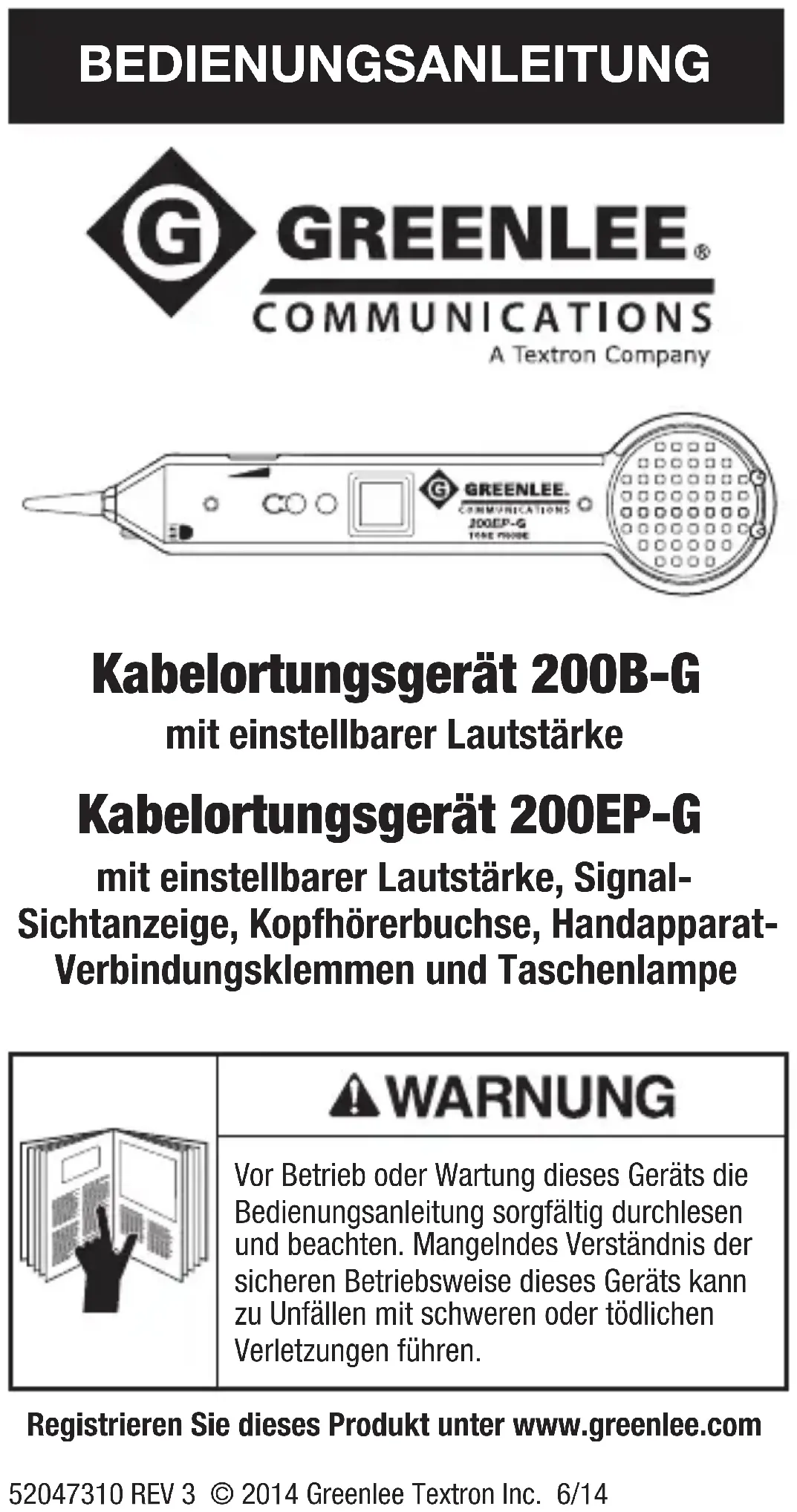 TORNILLOS. Limpieza Limpie periódicamente utilizando un paño húmedo y detergente suave; no utilice abrasivos ni disolventes.Garantía limitada de un año Greenlee Textron Inc. le garantiza al comprador original de estos bienes de uso, que los mismos estarán libres de defectos de materiales y fabricación durante un año, excepto en el caso de que sean maltratados o hayan sufrido el deterioro normal. Para toda reparación de los instrumentos de verificación, se debe solicitar primero un Número de autorización de devolución, llamando a nuestro Departamento de atención al cliente, a través de uno de los siguientes números: libre de cargo en EE.UU. y Canadá 800-642-2155 Teléfono +1 760-598-8900 Fax +1 760-598-5634. Este número debe aparecer claramente marcado en la etiqueta de envío. Envíe las unidades con porte pagado a: Greenlee Repair Center, 1390 Aspen Way, Vista, CA 92081 USA. Marque todos los paquetes de la siguiente manera: Atención: REPARACIONES DE INSTRUMENTOS DE VERIFICACIÓN. Puede obtener, previa solicitud, una cotización de precios de reparación para aquellos artículos que no están cubiertos bajo esta garantía (los que se han dejado caer o han sido maltratados) Aviso: Antes de devolver un instrumento de verificación, por favor revise para asegurarse que las baterías estén completamente cargadas. Greenlee / A Textron Company 4455 Boeing Drive • Rockford, IL 61109-2988 • USA 815-397-7070 Greenlee Textron Inc. is a subsidiary of Textron Inc. www.greenlee.com ¡No deseche ni descarte este producto! Para información sobre reciclaje, visite www.greenlee.com.BEDIENUNGSANLEITUNG Kabelortungsgerät 200B-G mit einstellbarer Lautstärke Kabelortungsgerät 200EP-G mit einstellbarer Lautstärke, Signal- Sichtanzeige, Kopfhörerbuchse, Handapparat- Verbindungsklemmen und Taschenlampe Vor Betrieb oder Wartung dieses Geräts die Bedienungsanleitung sorgfältig durchlesen und beachten. Mangelndes Verständnis der sicheren Betriebsweise dieses Geräts kann zu Unfällen mit schweren oder tödlichen Verletzungen führen. Registrieren Sie dieses Produkt unter www.greenlee.com 52047310 REV 3 © 2014 Greenlee Textron Inc. 6/1426 SICHERHEITS- WARNSYMBOL Dieses Symbol macht Sie auf gefährliche oder riskante Praktiken aufmerksam, die zu Schäden oder Verletzungen führen können. Das Signalwort, wie nachfolgend definiert, gibt den Schweregrad der Gefahr an. Der dem Signalwort folgende Hinweis informiert darüber, wie die Gefahr vermieden wird. Akute Gefahr, die bei Nichtvermeiden zu schweren Verletzungen oder zum Tod FÜHRT. Gefahr, die bei Nichtvermeiden zu schweren Verletzungen oder zum Tod führen KANN. Gefahr oder unsichere Praktiken, die bei Nichtvermeiden zu Verletzungen oder Sachschäden führen KÖNNEN. Befindet sich das Gerät im Lautsprecher-Modus, muss die Entfernung zwischen Lautsprecher undOhr mindestens 30 cm betragen. Ein diesbezüglicher Missbrauch kann zu Hörschäden führen. Alle technischen Daten sind Nennwerte. Bei Designverbesserungen sind Änderungen der Nennwerte vorbehalten. Greenlee Textron Inc. haftet nicht für Schäden, die sich aus der falschen Anwendung oder dem Missbrauch seiner Produkte ergeben.