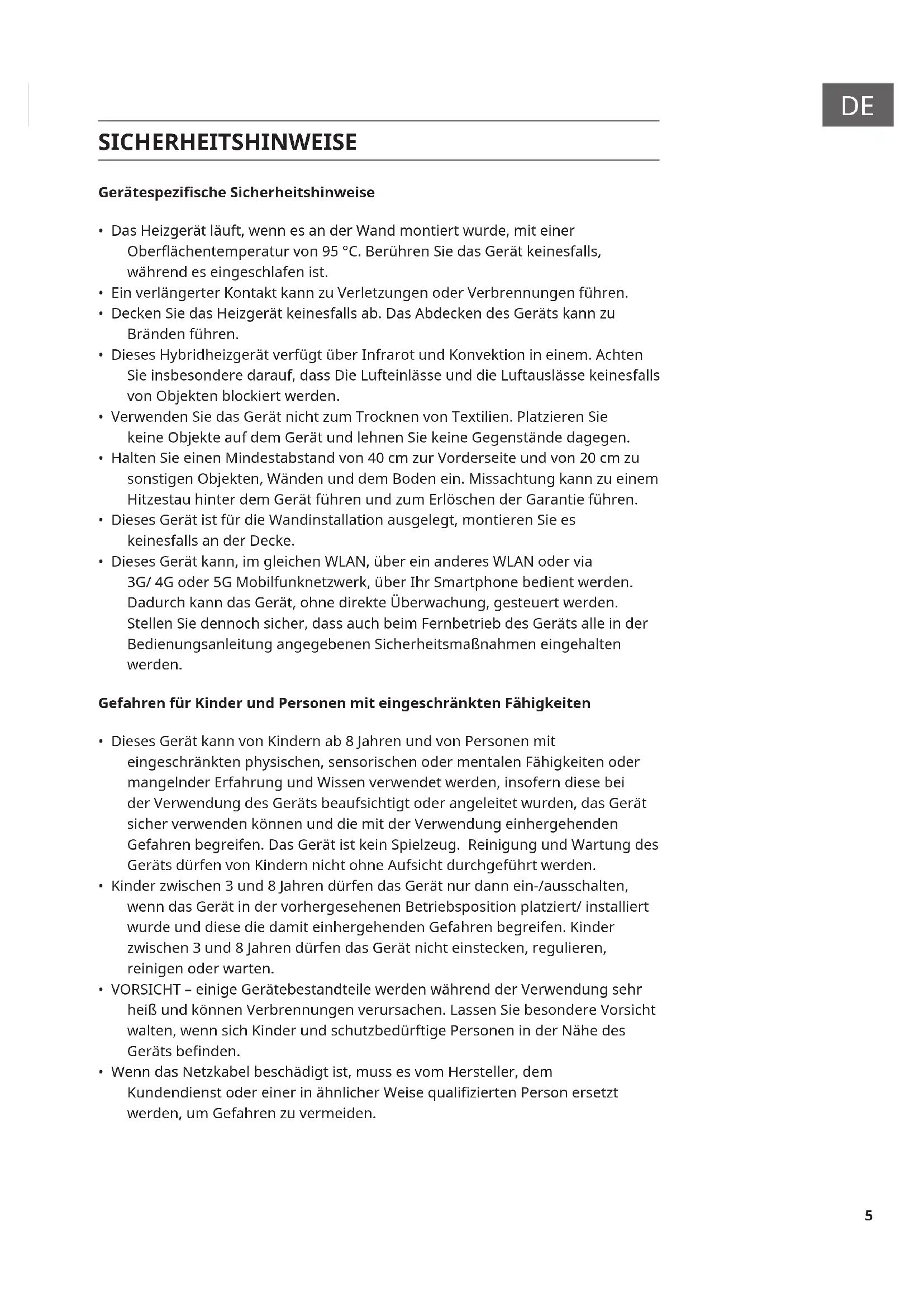 - Verwenden Sie das Gerät nicht in kleinen Räumen, wenn sich darin Personen benden, welche den Raum nicht aus eigener Kraft verlassen können. Die Oberäche des Heizgeräts kann eine Oberächentemperatur von bis zu 95 °C erreichen. Achten Sie darauf, dass sich das Gerät außerhalb der Reichweite von Kindern und Menschen mit Behinderung bendet.