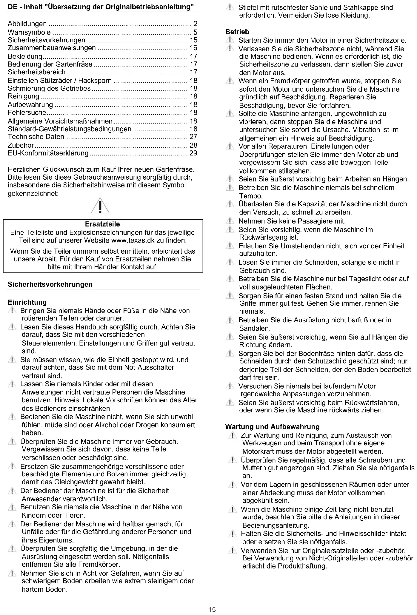 Ersatzteile Eine Teileliste und Explosionszeichnungen für das jeweilige Teil sind auf unserer Website www.texas.dk zu finden. Wenn Sie die Teilenummern selbst ermitteln, erleichtert das unsere Arbeit. Für den Kauf von Ersatzteilen nehmen Sie bitte mit Ihrem Händler Kontakt auf. Sicherheitsvorkehrungen Einrichtung Bringen Sie niemals Hände oder Füße in die Nähe von rotierenden Teilen oder darunter. Lesen Sie dieses Handbuch sorgfältig durch. Achten Sie darauf, dass Sie mit den verschiedenen Steuerelementen, Einstellungen und Griffen gut vertraut sind. Sie müssen wissen, wie die Einheit gestoppt wird, und darauf achten, dass Sie mit dem Not-Ausschalter vertraut sind. Lassen Sie niemals Kinder oder mit diesen Anweisungen nicht vertraute Personen die Maschine benutzen. Hinweis: Lokale Vorschriften können das Alter des Bedieners einschränken. Bedienen Sie die Maschine nicht, wenn Sie sich unwohl fühlen, müde sind oder Alkohol oder Drogen konsumiert haben. Überprüfen Sie die Maschine immer vor Gebrauch. Vergewissern Sie sich davon, dass keine Teile verschlissen oder beschädigt sind. Ersetzen Sie zusammengehörige verschlissene oder beschädigte Elemente und Bolzen immer gleichzeitig, damit das Gleichgewicht gewahrt bleibt. Der Bediener der Maschine ist für die Sicherheit Anwesender verantwortlich. Benutzen Sie niemals die Maschine in der Nähe von Kindern oder Tieren. Der Bediener der Maschine wird haftbar gemacht für Unfälle oder für die Gefährdung anderer Personen und ihres Eigentums. Überprüfen Sie sorgfältig die Umgebung, in der die Ausrüstung eingesetzt werden soll. Nötigenfalls entfernen Sie alle Fremdkörper. Nehmen Sie sich in Acht vor Gefahren, wenn Sie auf schwierigem Boden arbeiten wie extrem steinigem oder hartem Boden. Stiefel mit rutschfester Sohle und Stahlkappe sind erforderlich. Vermeiden Sie lose Kleidung. Betrieb Starten Sie immer den Motor in einer Sicherheitszone. Verlassen Sie die Sicherheitszone nicht, während Sie die Maschine bedienen. Wenn es erforderlich ist, die Sicherheitszone zu verlassen, dann stellen Sie zuvor den Motor aus. Wenn ein Fremdkörper getroffen wurde, stoppen Sie sofort den Motor und untersuchen Sie die Maschine gründlich auf Beschädigung. Reparieren Sie Beschädigung, bevor Sie fortfahren. Sollte die Maschine anfangen, ungewöhnlich zu vibrieren, dann stoppen Sie die Maschine und untersuchen Sie sofort die Ursache. Vibration ist im allgemeinen ein Hinweis auf Beschädigung. Vor allen Reparaturen, Einstellungen oder Überprüfungen stellen Sie immer den Motor ab und vergewissern Sie sich, dass alle bewegten Teile vollkommen stillstehen. Seien Sie äußerst vorsichtig beim Arbeiten an Hängen. Betreiben Sie die Maschine niemals bei schnellem Tempo. Überlasten Sie die Kapazität der Maschine nicht durch den Versuch, zu schnell zu arbeiten. Nehmen Sie keine Passagiere mit. Seien Sie vorsichtig, wenn die Maschine im Rückwärtsgang ist. Erlauben Sie Umstehenden nicht, sich vor der Einheit aufzuhalten. Lösen Sie immer die Schneiden, solange sie nicht in Gebrauch sind. Betreiben Sie die Maschine nur bei Tageslicht oder auf voll ausgeleuchteten Flächen. Sorgen Sie für einen festen Stand und halten Sie die Griffe immer gut fest. Gehen Sie immer, rennen Sie niemals. Betreiben Sie die Ausrüstung nicht barfuß oder in Sandalen. Seien Sie äußerst vorsichtig, wenn Sie auf Hängen die Richtung ändern. Sorgen Sie bei der Bodenfräse hinten dafür, dass die Schneiden durch den Schutzschild geschützt sind; nur derjenige Teil der Schneiden, der den Boden bearbeitet darf frei sein. Versuchen Sie niemals bei laufendem Motor irgendwelche Anpassungen vorzunehmen. Seien Sie äußerst vorsichtig beim Rückwärtsfahren, oder wenn Sie die Maschine rückwärts ziehen. Wartung und Aufbewahrung Zur Wartung und Reinigung, zum Austausch von Werkzeugen und beim Transport ohne eigene Motorkraft muss der Motor abgestellt werden. Überprüfen Sie regelmäßig, dass alle Schrauben und Muttern gut angezogen sind. Ziehen Sie sie nötigenfalls an. Vor dem Lagern in geschlossenen Räumen oder unter einer Abdeckung muss der Motor vollkommen abgekühlt sein. Wenn die Maschine einige Zeit lang nicht benutzt wurde, beachten Sie bitte die Anleitungen in dieser Bedienungsanleitung. Halten Sie die Sicherheits- und Hinweisschilder intakt oder ersetzen Sie sie nötigenfalls. Verwenden Sie nur Originalersatzteile oder -zubehör. Bei Verwendung von Nicht-Originalteilen oder -zubehör erlischt die Produkthaftung.16
