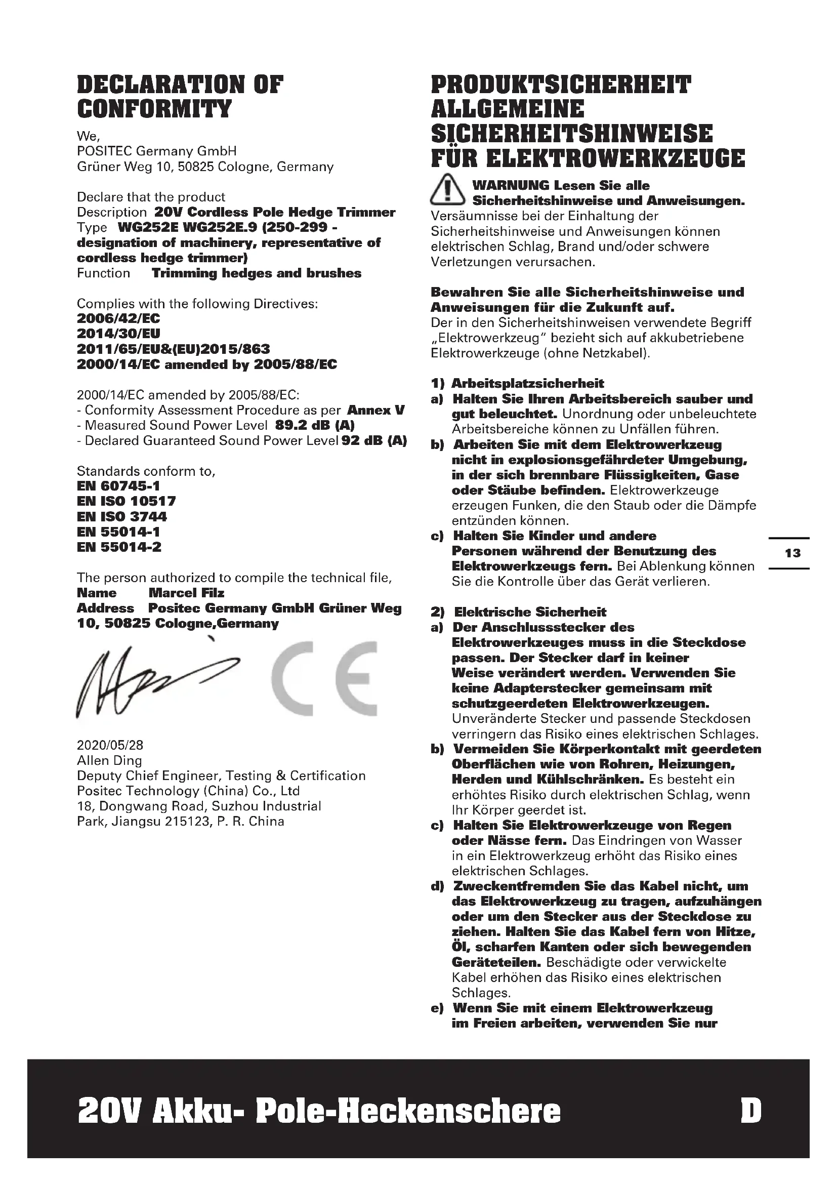 Wir, POSITEC Germany GmbH Grüner Weg 10, 50825 Cologne, Germany Erklären hiermit, dass unser Produkt Beschreibung Schnurlose Teleskop- Heckenschere Typ WG252E WG252E.9 (250-299 - Bezeichnung der Maschine, Repräsentant der kabellose Heckenschere) Funktion Beschneiden von Hecken und Sträuchern Den bestimmungen der folgenden richtlinien entspricht: 2006/42/EC 2014/30/EU 2011/65/EU&(EU)2015/863 2000/14/EC geändert durch 2005/88/EC 2000/14/EC geändert durch 2005/88/EC: - Konformitätsbewertungsverfahren nach Anhang V - Gemessene Schallleistung 89.2 dB (A) - Garantierte Schallleistung 92 dB (A) Werte nach, EN 60745-1 EN ISO 10517 EN ISO 3744 EN 55014-1 EN 55014-2 Zur Kompilierung der technischen Datei ermächtigte Person Name Marcel Filz Anschrift Positec Germany GmbH Grüner Weg 10, 50825 Cologne, Germany 2020/05/28 Allen Ding Stellvertretender Chefingenieur, Prüfung und Zertifizierung Positec Technology (China) Co., Ltd 18, Dongwang Road, Suzhou Industrial Park, Jiangsu 215123, P. R. China2120 Tondeuse à haie sans fil 20V F