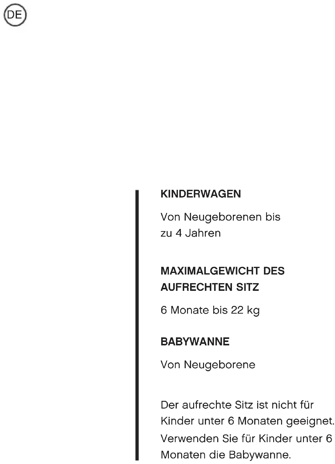 - Dieser Kinderwagen ist für Kinder im Alter von Neugeborenen bis zu 4 Jahren. Altersspanne für den Hauptsitz: 6 Monate bis 22 kg. Altersspanne in die Babywanne: Neugeborene bis 9 kg. Die Babywanne wird für Neugeborene empfohlen. • Die Babywanne darf nicht mehr verwendet werden, sobald das Kind sich selbst aufsetzen, drehen und sich auf den Händen und Knien aufstützen kann. Maximalgewicht für Kinder in die Babywanne: 9kg. • Der aufrechte Sitz ist nicht für Kinder unter 6 Monaten geeignet. • Der Buggy darf maximal für 1 Kinder benutzt werden. • Lassen Sie das Kind nie unbeaufsichtigt. • Verwenden Sie immer das Rückhaltesystem. • Zubehör oder Ersatzteile, die nicht vom Hersteller empfohlen werden, dürfen nicht eingesetzt werden. • Bitte verwenden Sie keine zusätzliche Matratze. • Bitte keinerlei Lasten an den Griff und/oder andere Teile des Kinderwagens. Dies kann die Stabilität des Kinderwagens beeinträchtigt. • Überschreiten Sie die Maximallast der Gepäckablage